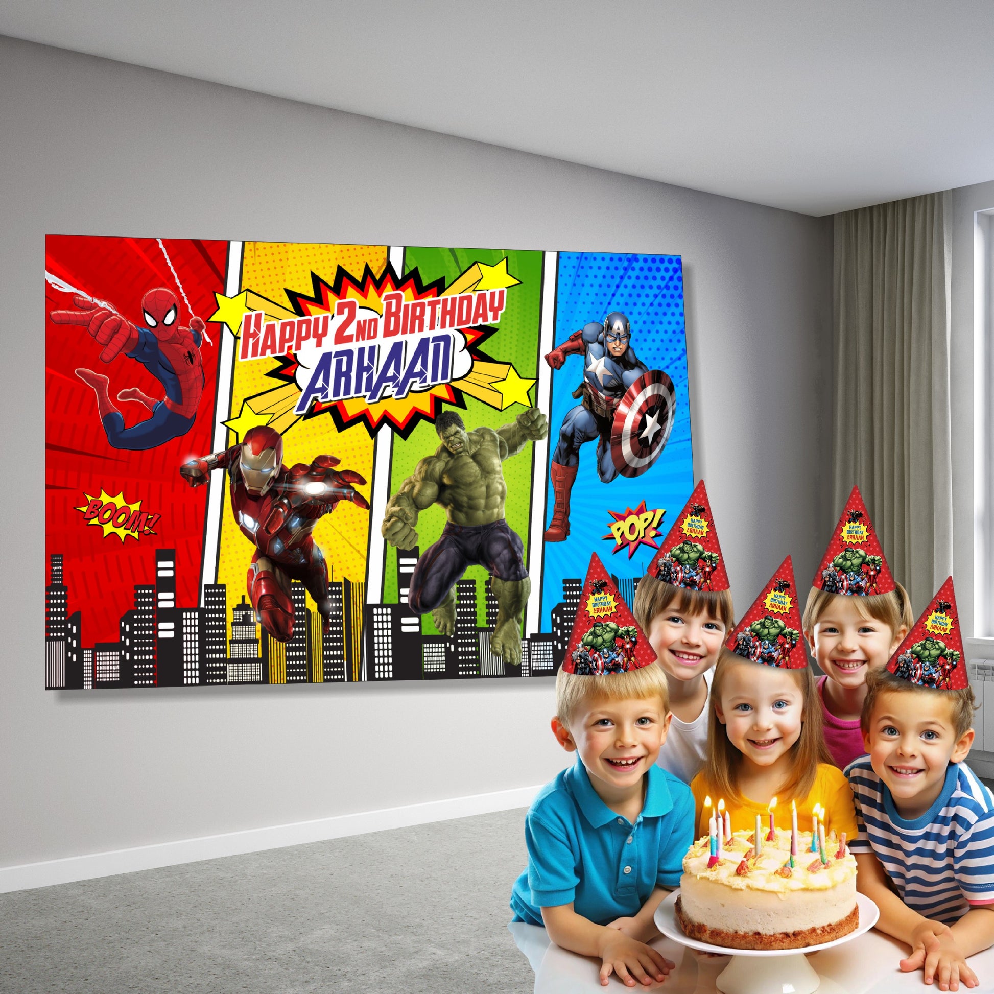 A customized backdrop is absolutely the biggest and most impactful piece of party decor! It serves as the primary photo zone and the anchor for the entire theme. Create a spectacular, cinematic setting for your party with this huge, Customized Avengers-themed backdrop! Designed to serve as the ultimate photo booth background and a commanding display behind the cake or main table, this piece guarantees an epic atmosphere.