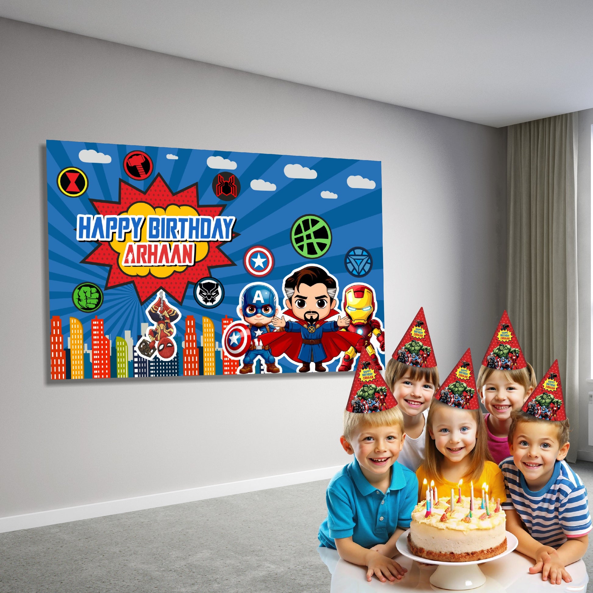A customized backdrop is absolutely the biggest and most impactful piece of party decor! It serves as the primary photo zone and the anchor for the entire theme. Create a spectacular, cinematic setting for your party with this huge, Customized Avengers-themed backdrop! Designed to serve as the ultimate photo booth background and a commanding display behind the cake or main table, this piece guarantees an epic atmosphere.