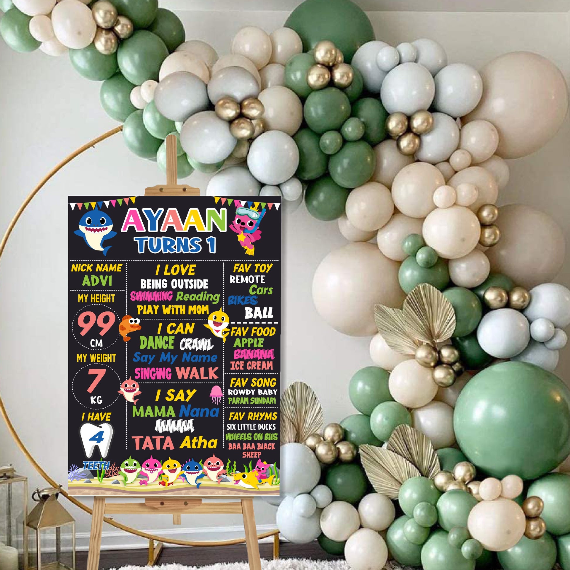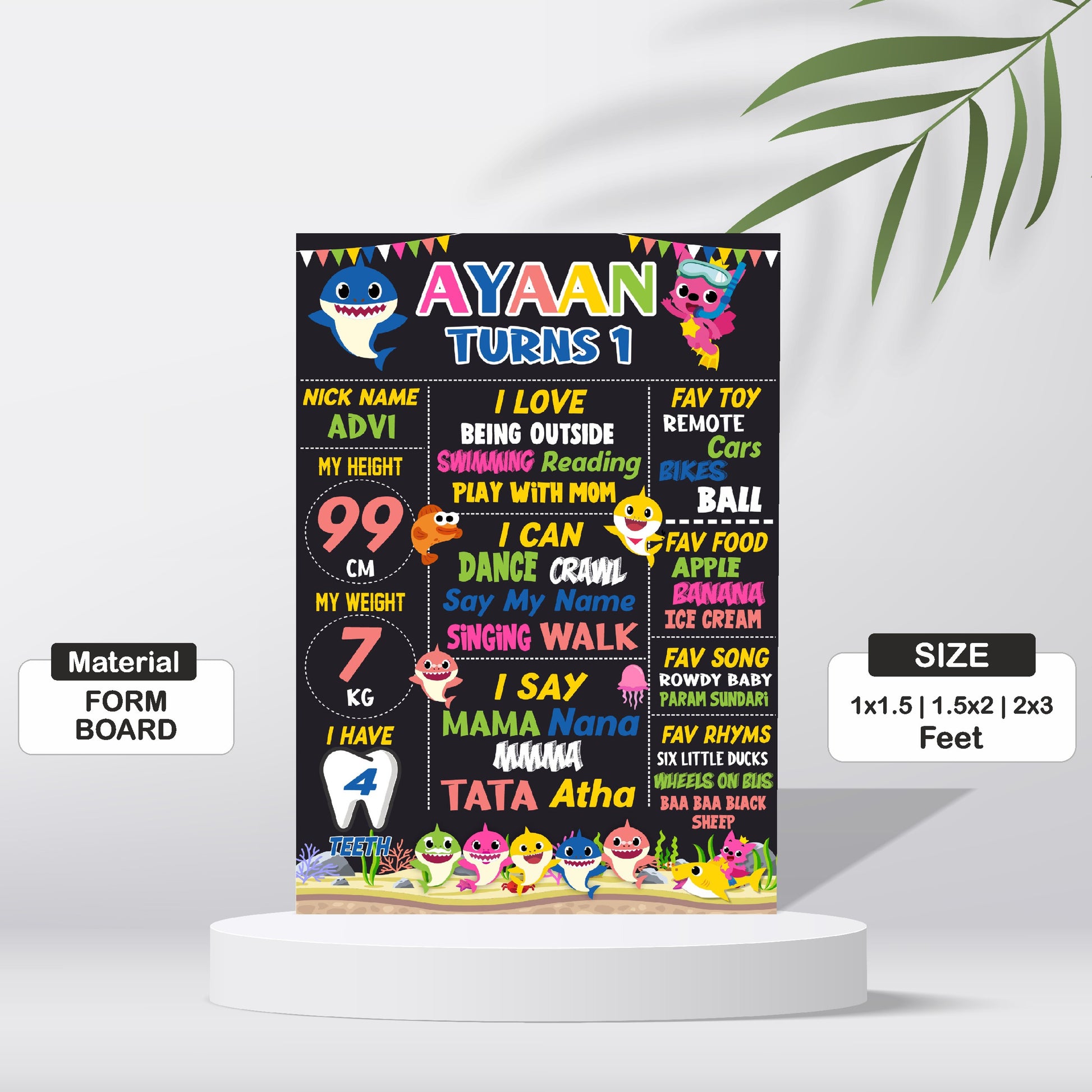 Announce the little swimmer's achievements! Our custom Baby Shark Chalkboard is a high-quality, fully personalized poster featuring a stunning design that blends the bubbly blue ocean backdrop with vibrant coral and all the Shark Family members. The chalkboard-style text highlights the birthday child's name, age, and favorite achievements, all organized around a central photo space. It’s a bright, detailed tribute to their growth and the perfect decoration for the party entrance or gift table