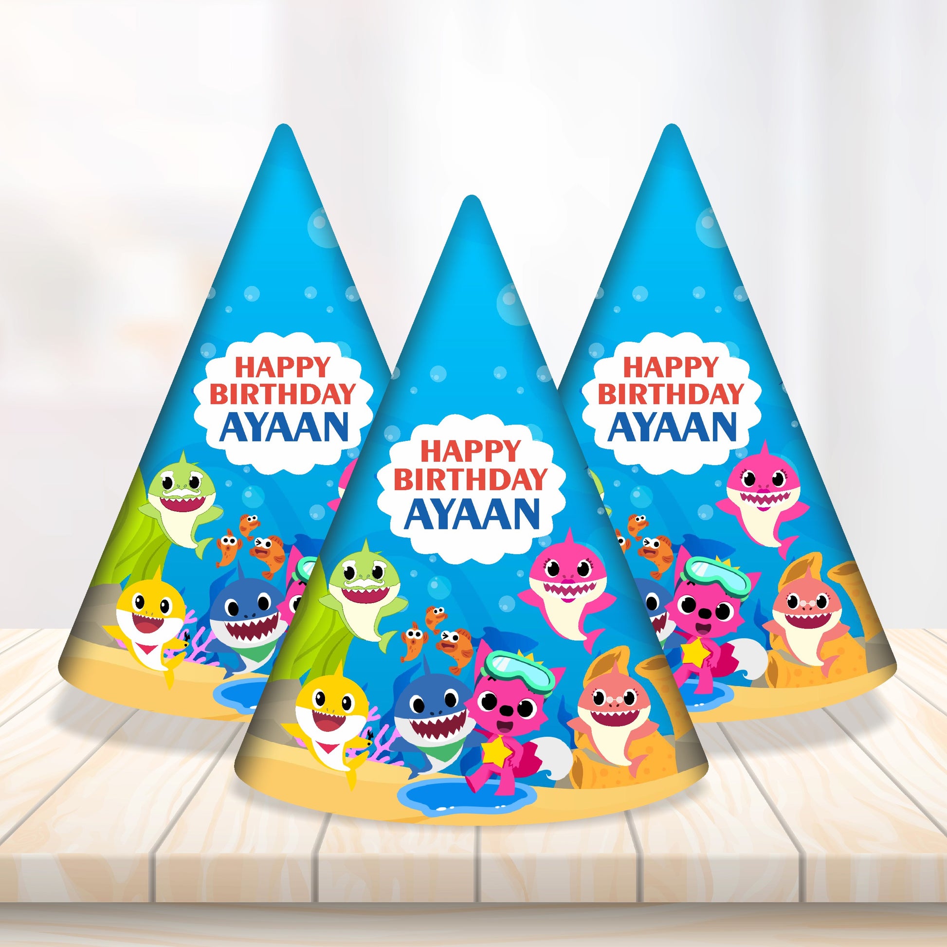 Top off the splashy celebration! Our personalized Baby Shark Birthday Hats are classic party cones decked out for an ocean adventure. Each hat is covered in vibrant wavy or bubbly patterns and topped with a fun, blue pom-pom or a small shark fin cutout. The front of the hat is customized with the birthday child's name and age, ensuring the star of the show is the cutest shark in the sea!