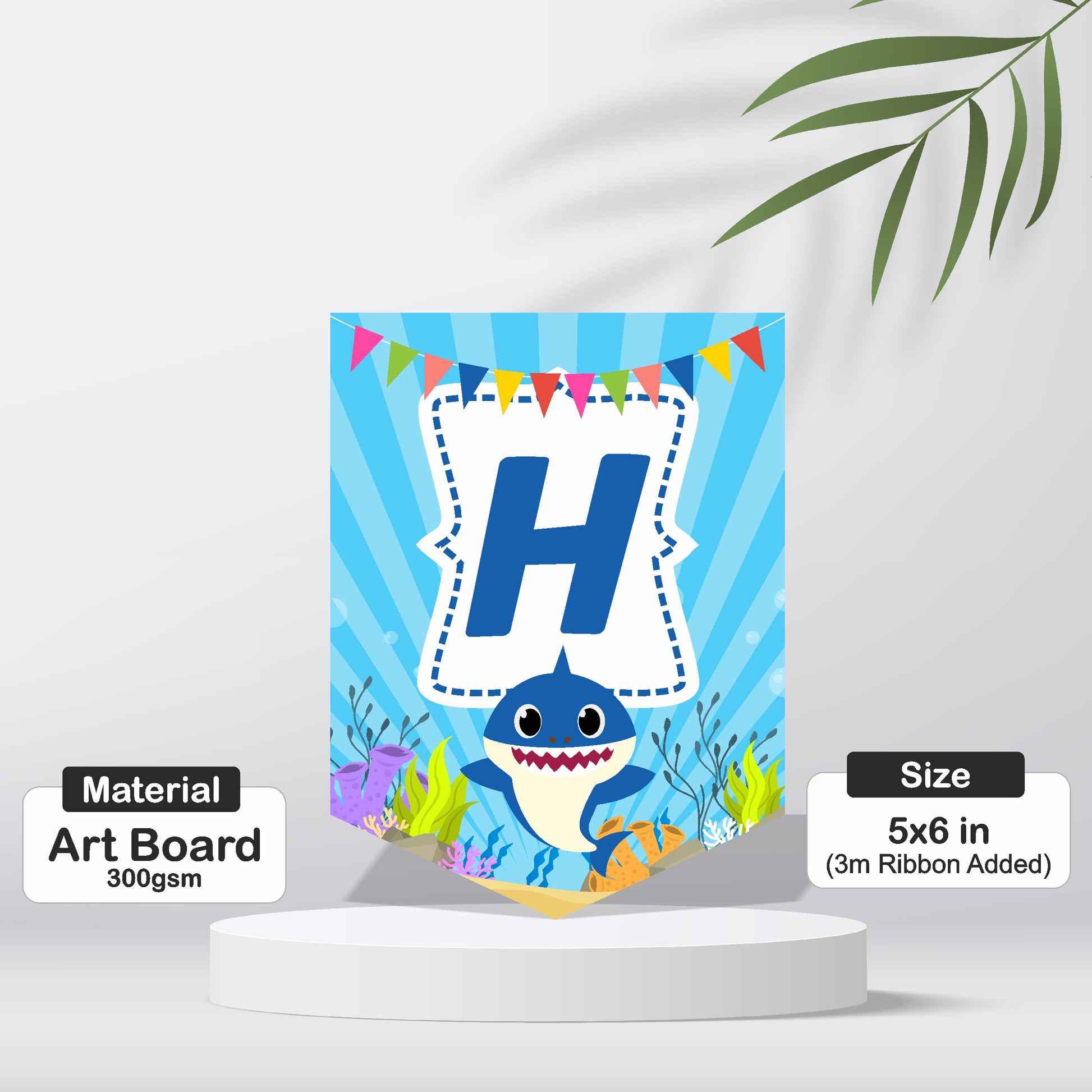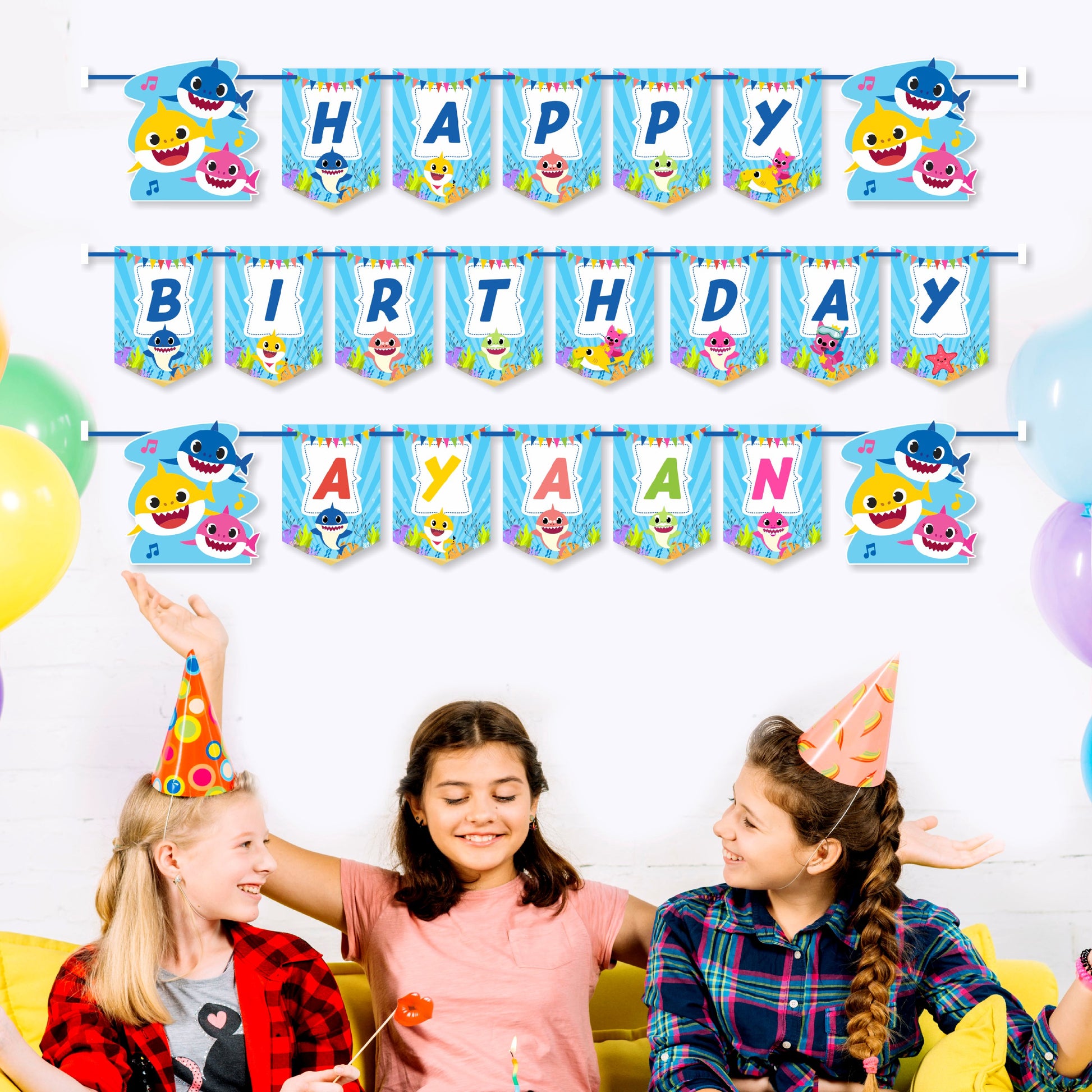 Announce the Star Swimmer! Our personalized Baby Shark Name Bunting features individual, cheerful letter flags, where each letter of your child's full name is decorated with a different Shark Family member (Mommy, Daddy, Baby, etc.) and fun ocean elements. This vibrant banner is perfect for hanging above the cake table or gift area, immediately personalizing the party space with a fun, doo-doo-doo theme!