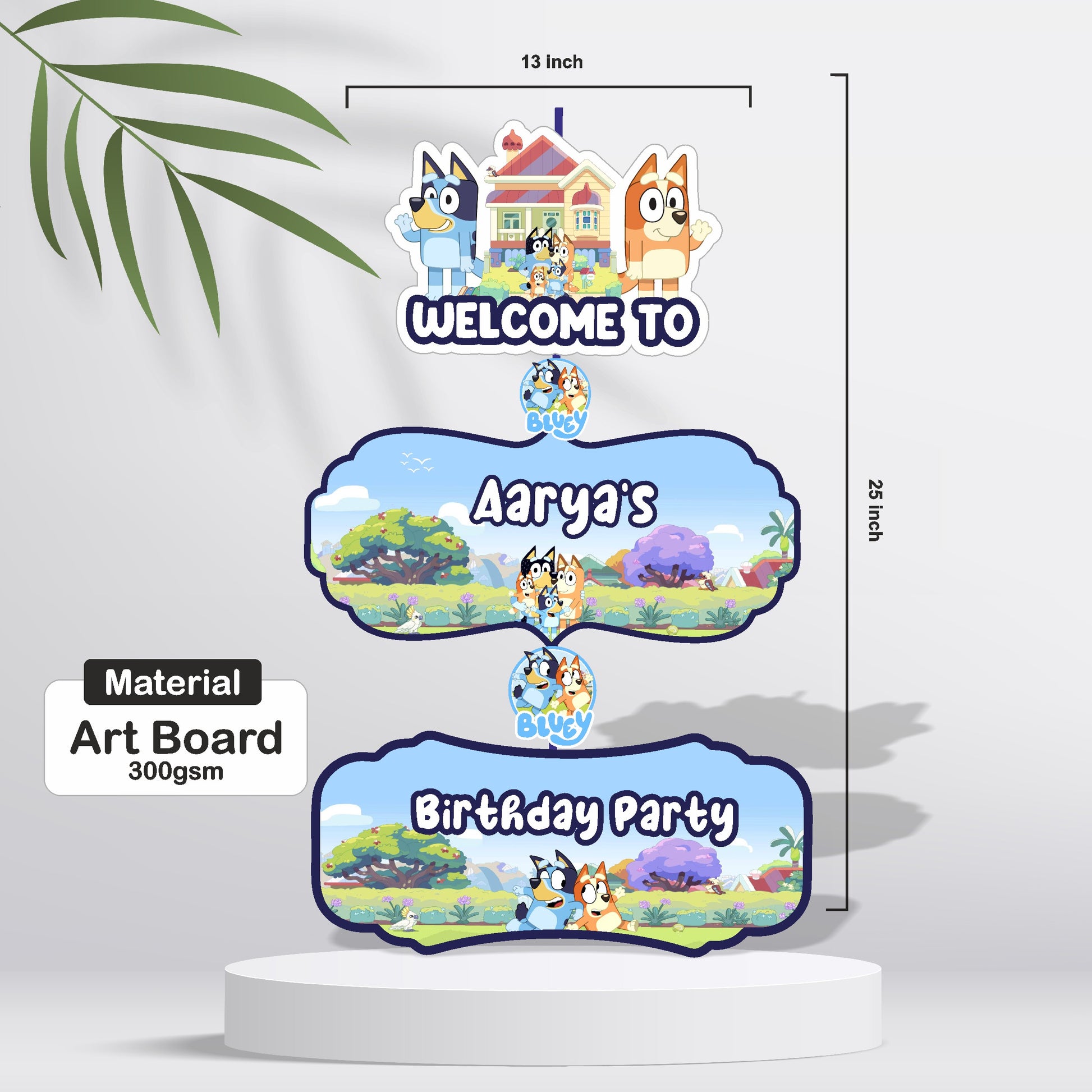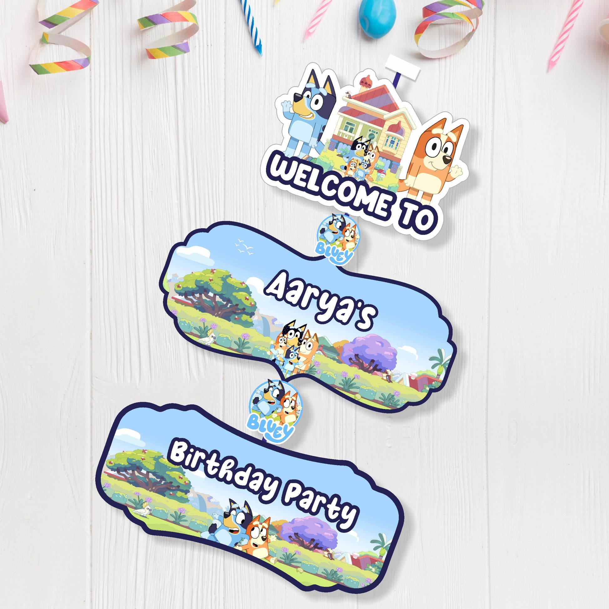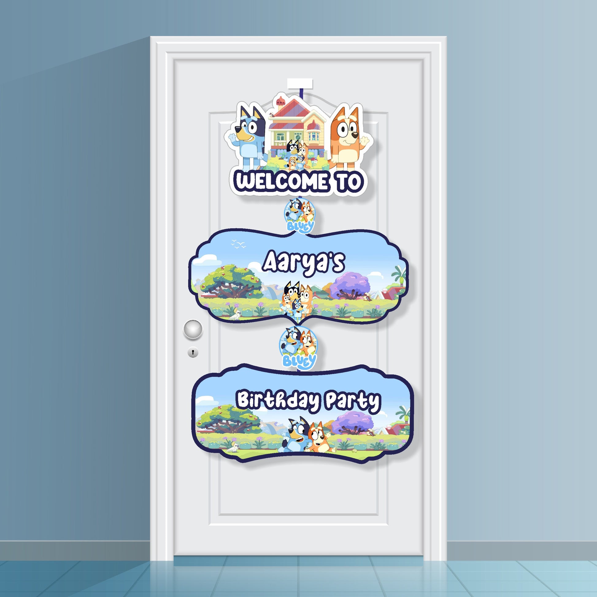 Start the celebration with a custom Bluey-themed door poster. This vibrant poster captures the fun and imagination of the show, making it look like your home is the start of a great adventure. Personalized with your child's name and age, it’s a fantastic way to set the scene and build excitement for the party!