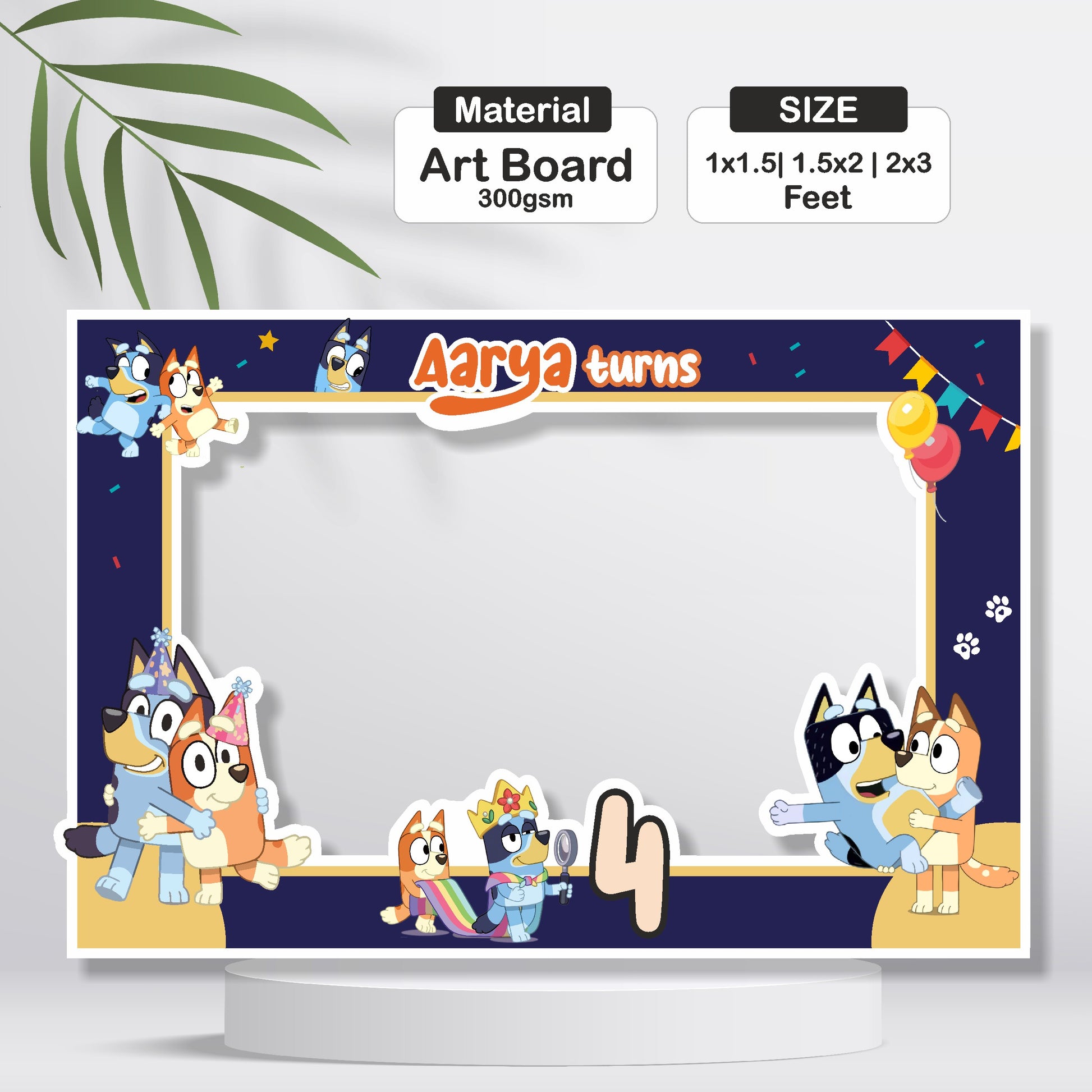 Time for a photo game! Create priceless memories with a personalized Bluey Photo Booth! This custom backdrop features the colorful world of Bluey and Bingo, and can be personalized with your child's name and age. It's the perfect spot for guests to strike a pose and capture the fun of the party!
