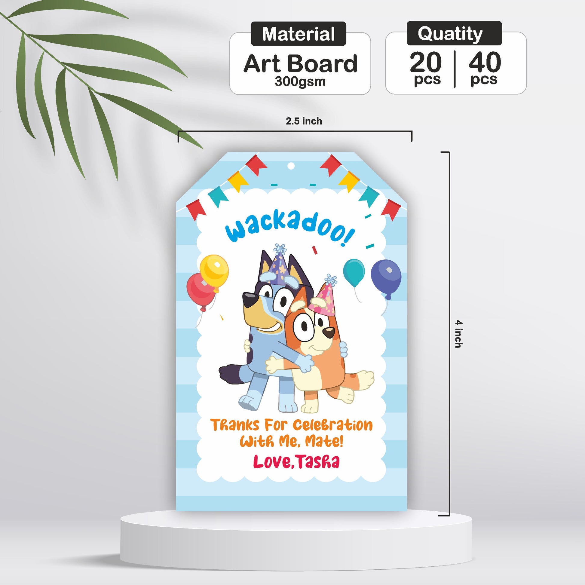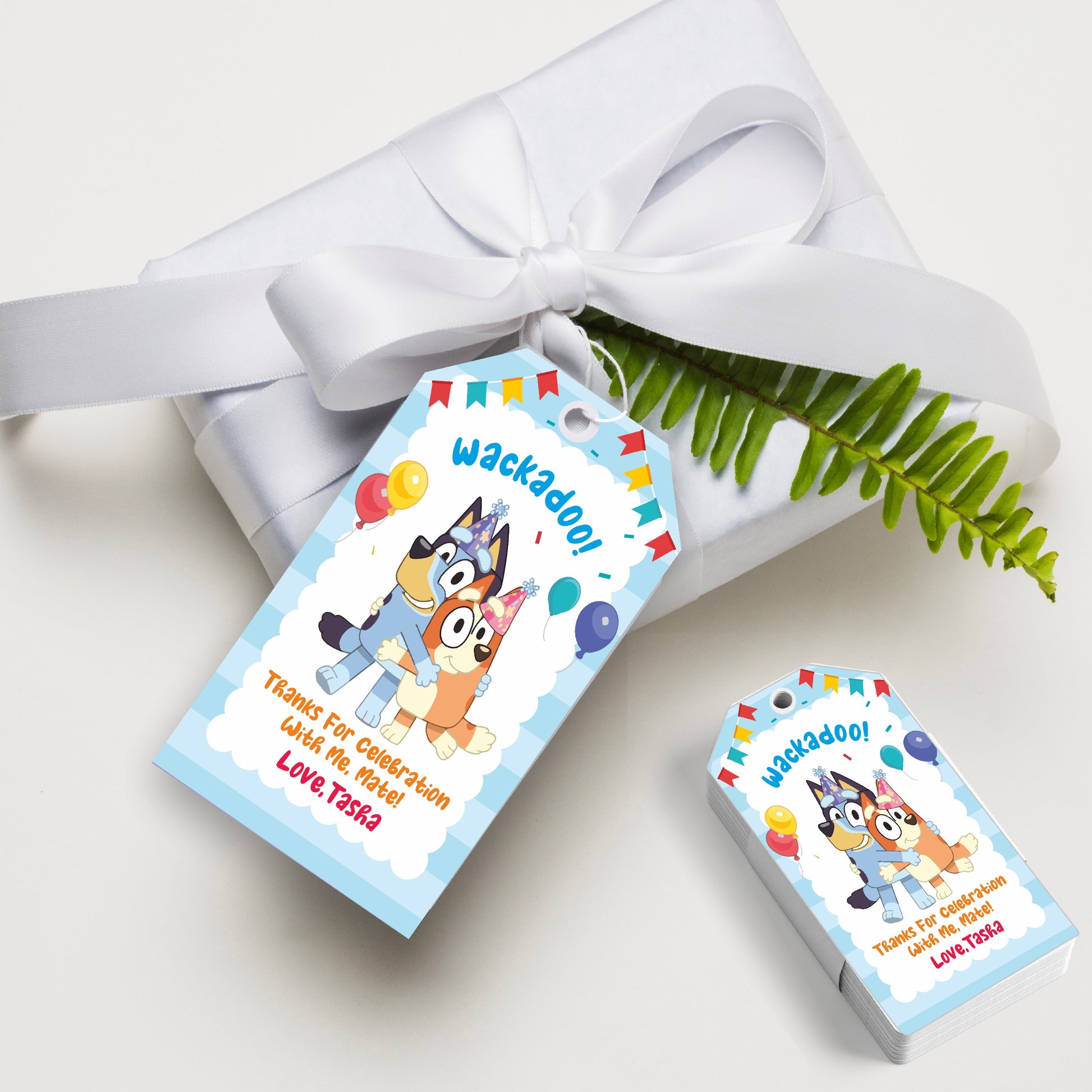 Add a fun, customized finishing touch to your favors with personalized Bluey birthday tags! Featuring Bluey, Bingo, and a playful design, these tags are the perfect way to label your party bags or gifts. Customize them with a cheerful "Thank You" message and your child's name for an extra sweet detail!