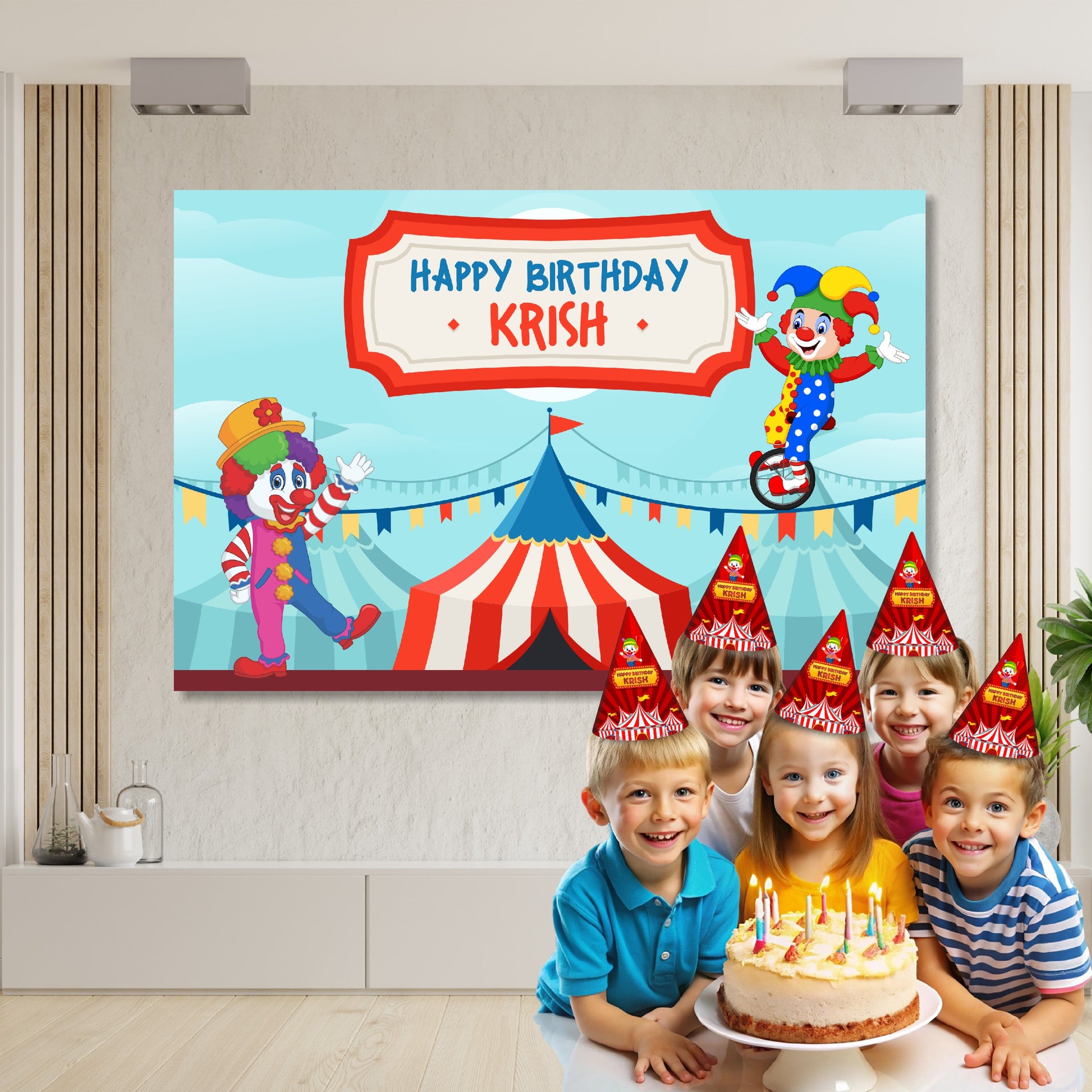 Welcome to the Greatest Show on Earth! Our custom Circus-Themed Banner is designed with the grandeur of a vintage poster, complete with bold typography, gold accents, and exciting characters like clowns, acrobats, and a ringmaster. This high-quality banner is fully personalized with your child's name and age, transforming your party space into a magical, unforgettable performance!