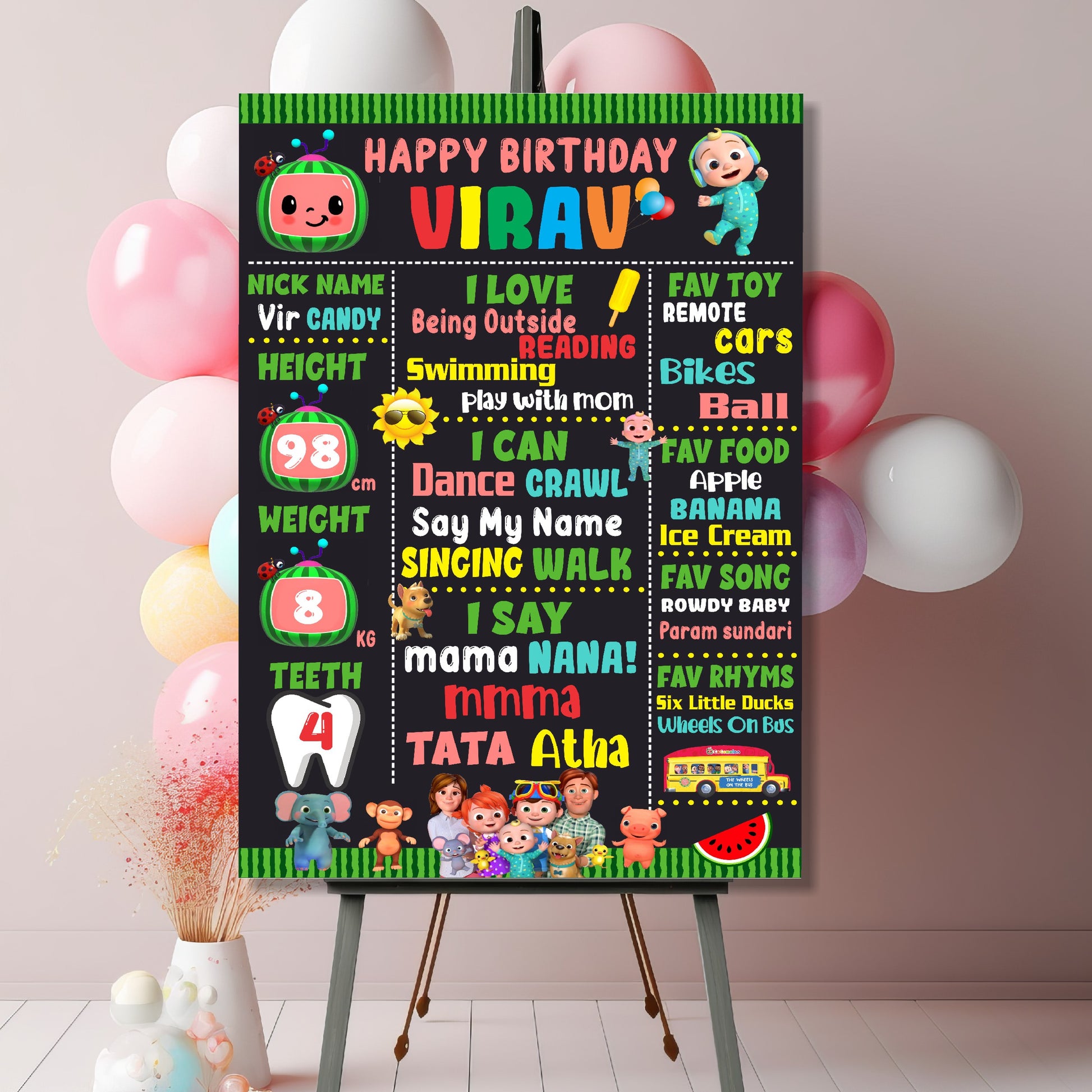 Capture all their adorable stats! Our personalized Cocomelon birthday chalkboard features JJ, the school bus, and other happy characters in a colorful scene. It highlights all the wonderful things that make your little one unique—from their favorite songs and first words to their age and height. It's a sweet, musical way to capture a snapshot of your party star!