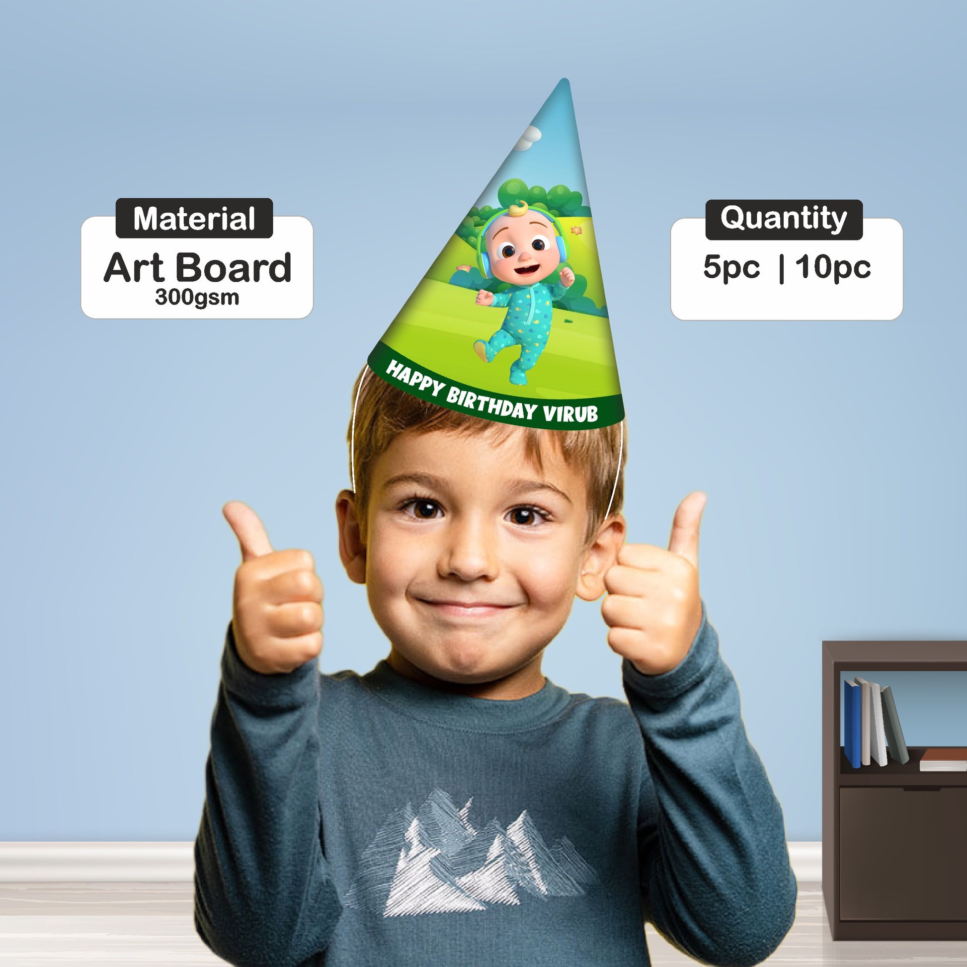 Get ready to sing and celebrate with a personalized Cocomelon birthday hat! These fun cone hats feature adorable graphics of JJ and his friends and can be customized with your child's name or age. They're the perfect accessory to make every little guest feel like part of the Cocomelon crew and ready for a musical party!