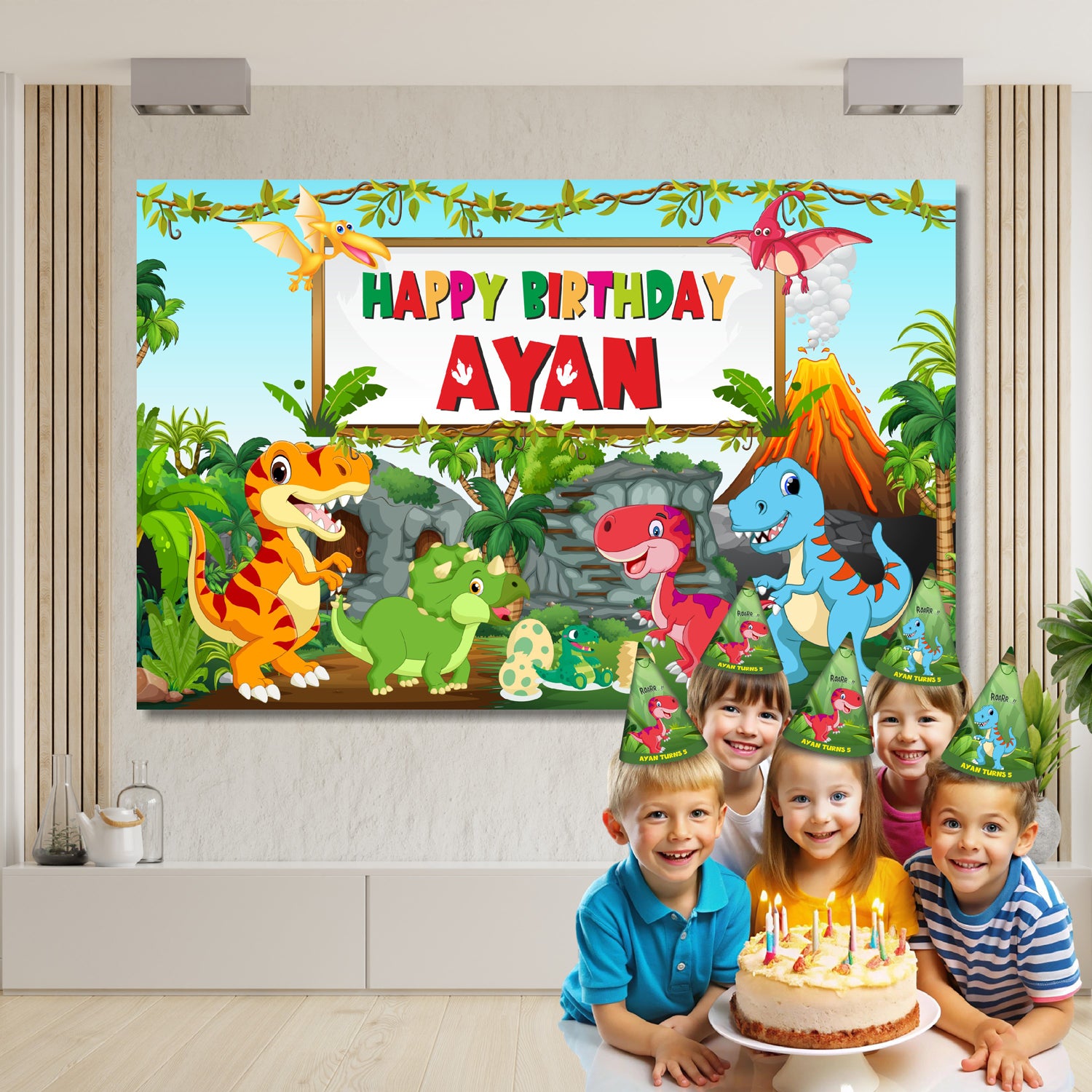 Roar! It's a party! Celebrate with a personalized dinosaur birthday banner. Featuring fun, cartoon dinos and a "Happy Birthday" message, this banner is the perfect way to welcome all your little paleontologists. You can customize it with your child's name and age for a truly roarsome touch.