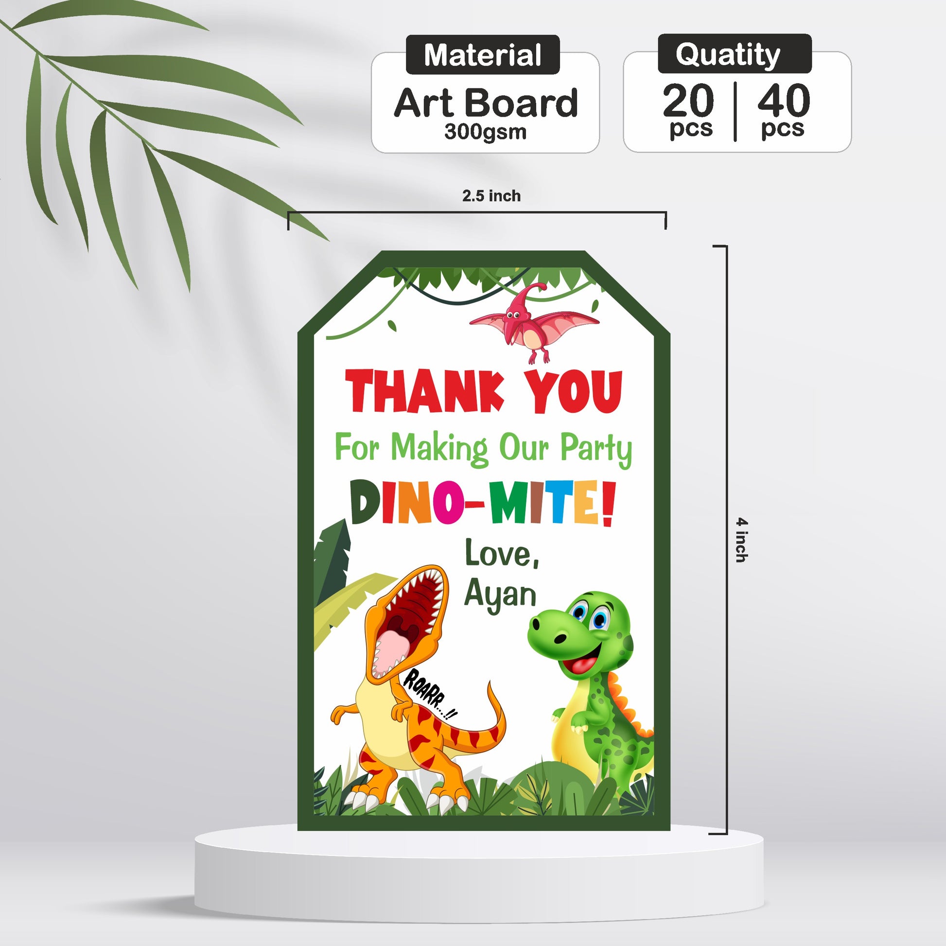 Express gratitude with our Dinosaur Theme Kids Birthday Customized Thank You Tag! Perfect for attaching to party favors, gifts, or goody bags, these tags feature cute dinosaur designs and can be personalized with your child's name and a thank you message. Made from durable cardstock, they add a special, personalized touch to your celebration. Say thanks in a fun, memorable way and leave a lasting impression on your guests!