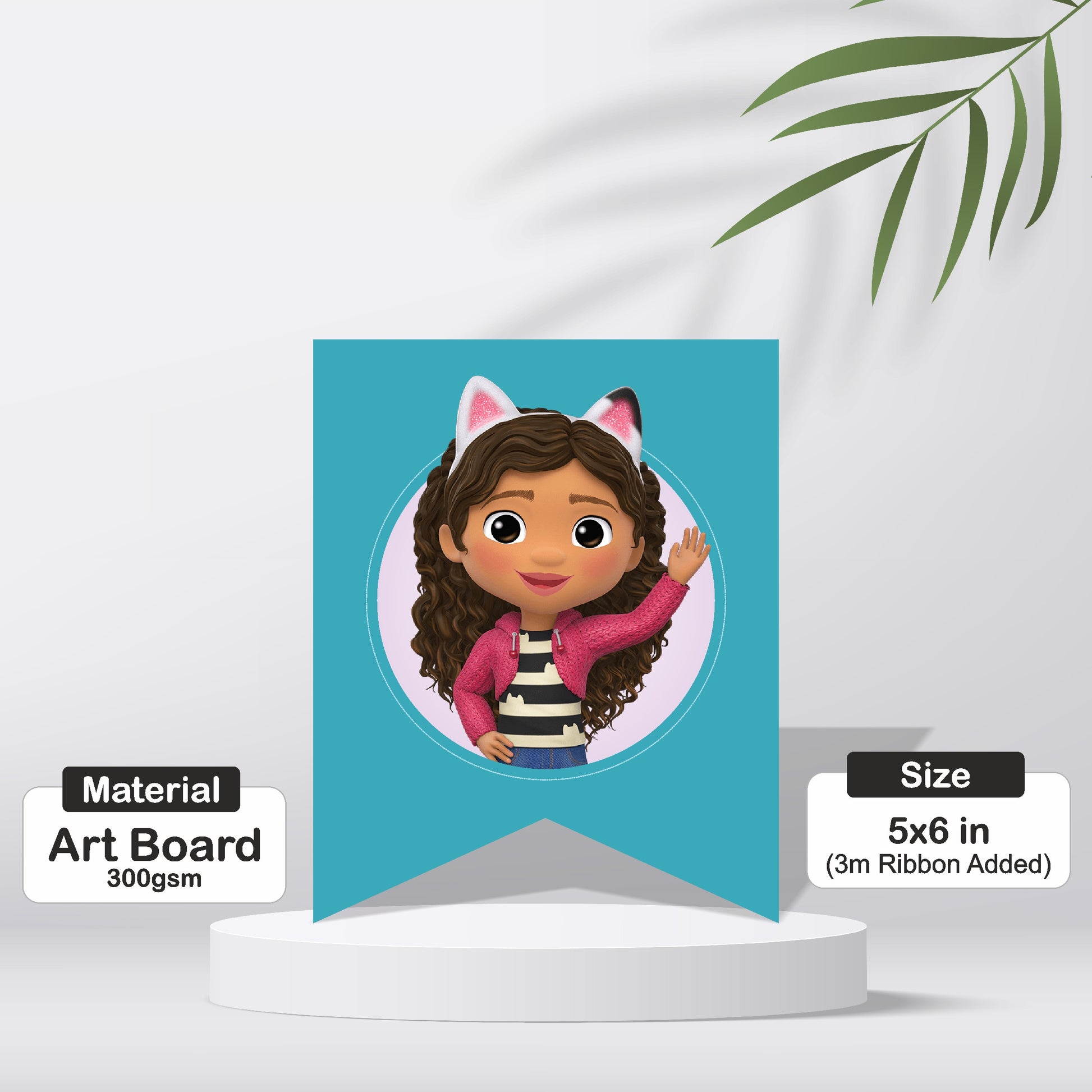 Bring the whole Cat-Tastic crew to your party with a personalized Gabby's Dollhouse character bunting! This banner features vibrant flags with Gabby, Pandy Paws, MerCat, and all their friends. and Cat-Tastic decoration that makes your celebration feel straight out of Gabby's magical world.