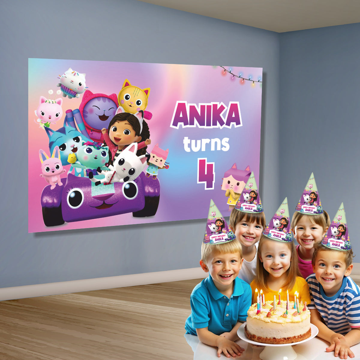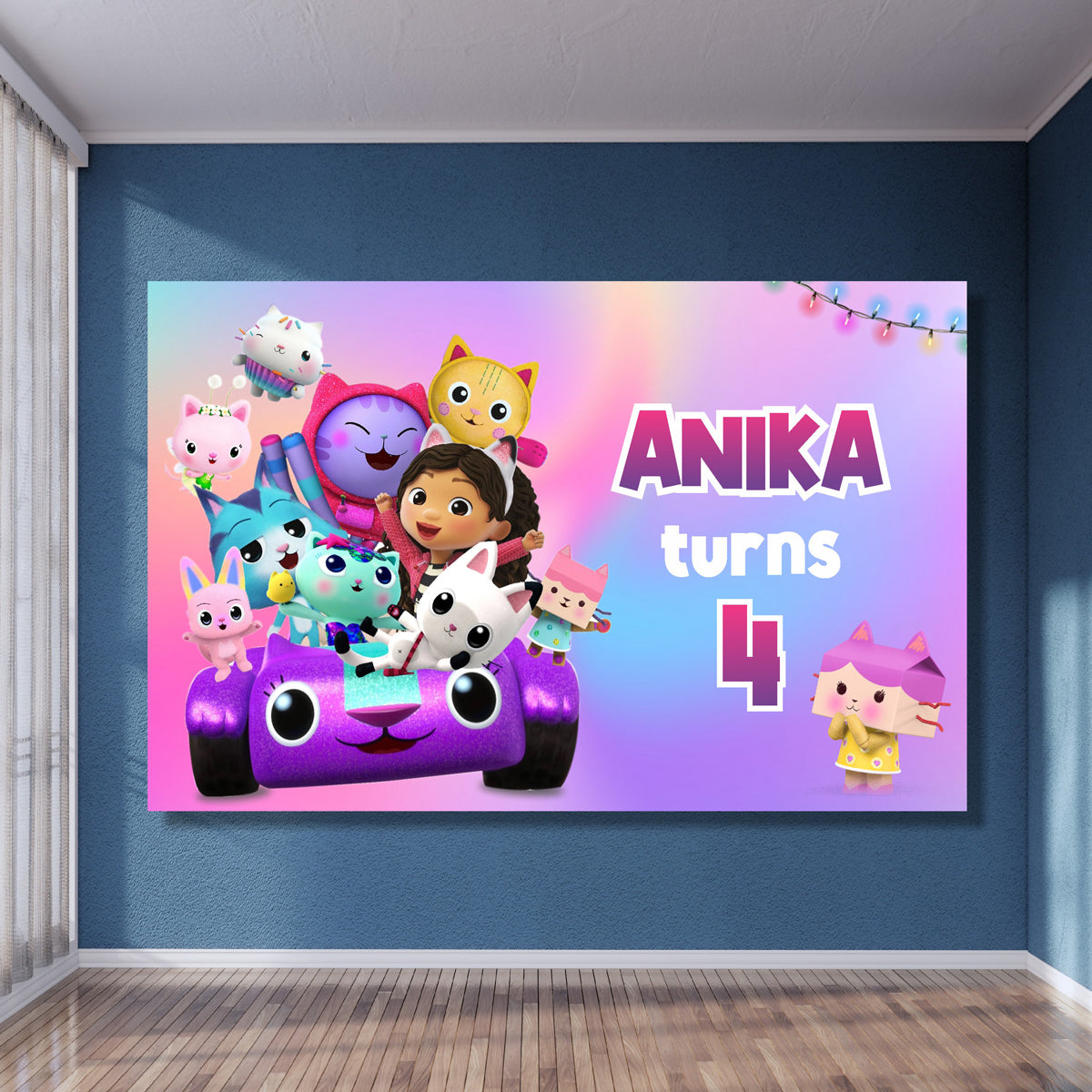Make their birthday a-meow-zing with a custom Gabby's Dollhouse-themed banner. This vibrant banner is designed with all the beloved characters and a colorful, playful background. Personalize it with your child's name and age to create a charming, one-of-a-kind decoration that sets the stage for a day of imagination and fun, straight from the dollhouse! make their special day even more magical.