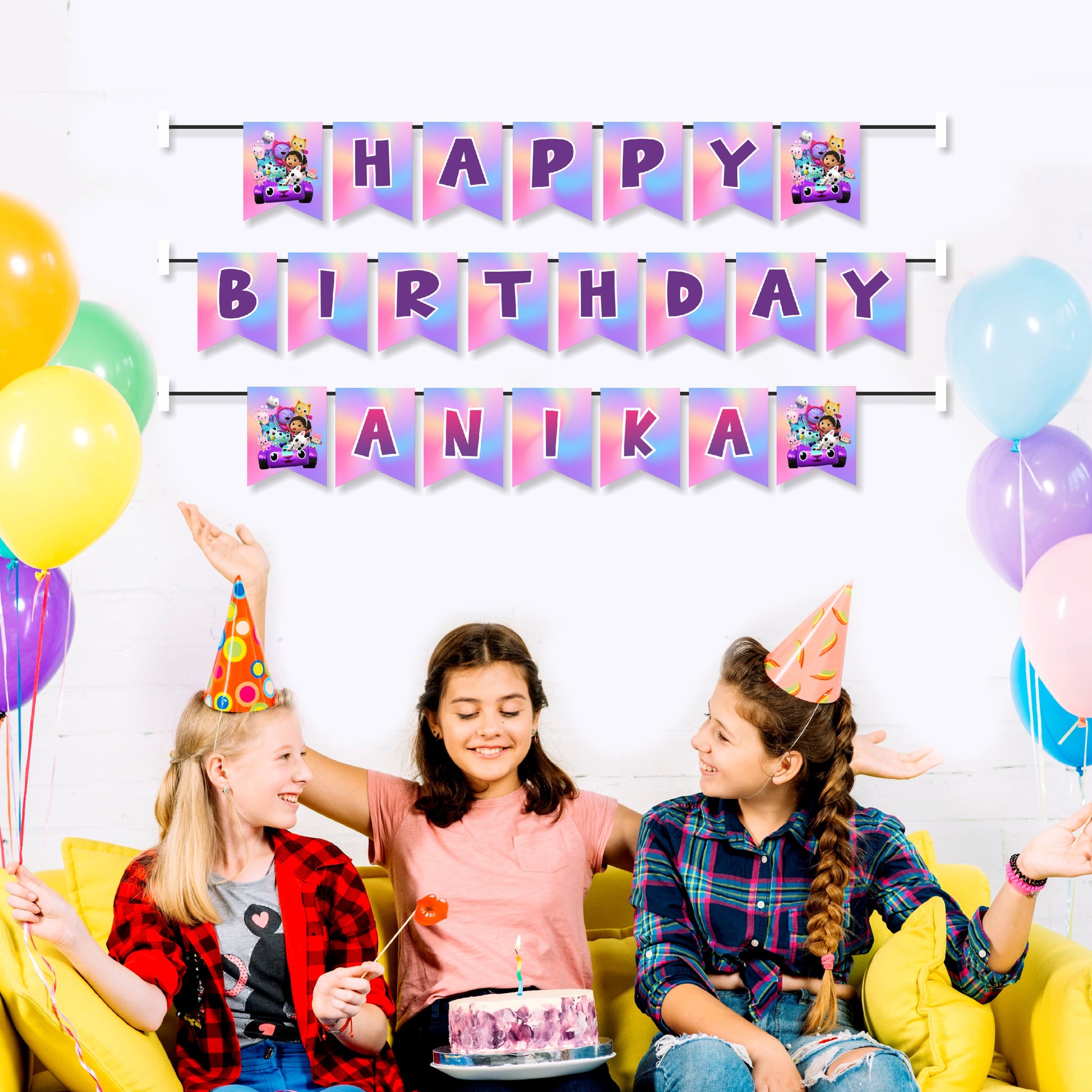 Make the birthday star feel extra magical with a personalized Gabby's Dollhouse Name Bunting! This adorable banner features vibrant flags with Gabby, Pandy Paws, and the Cat-Tastic crew, perfectly spelling out your child's name. It's the ultimate decoration to bring the fun of the dollhouse right to your party!