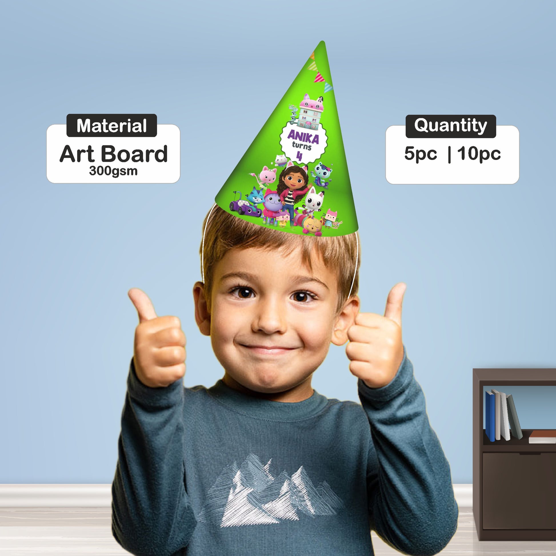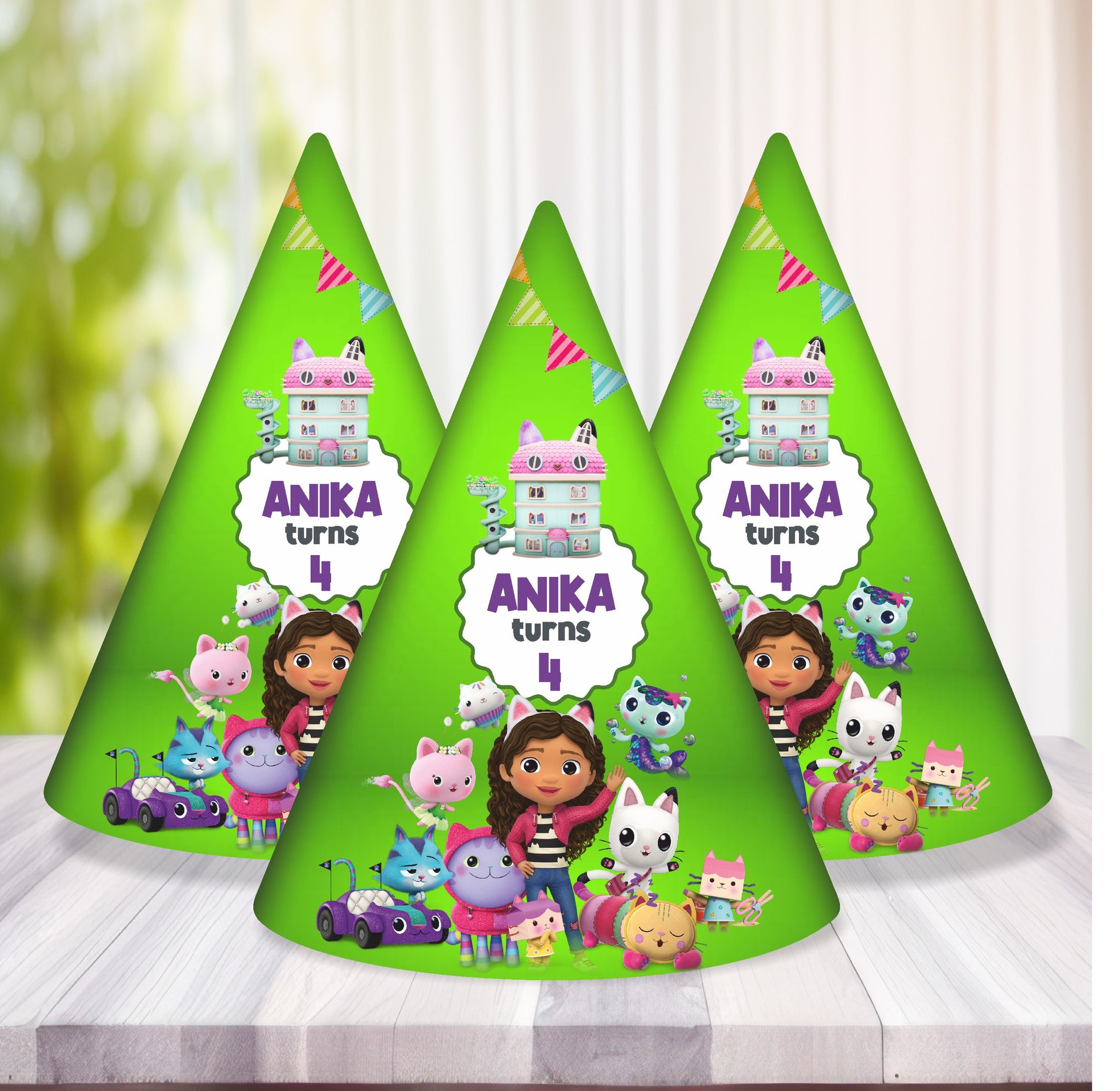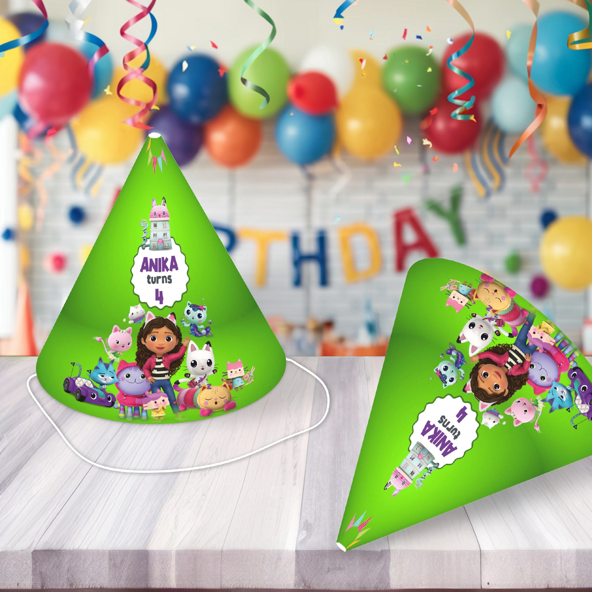 Get ready for a Cat-Tastic party with a personalized Gabby's Dollhouse birthday hat! These fun cone hats feature Gabby, Pandy Paws, and a colorful design, and can be customized with your child's name or age. They're the perfect accessory to make every little guest feel part of the magical Dollhouse celebration!