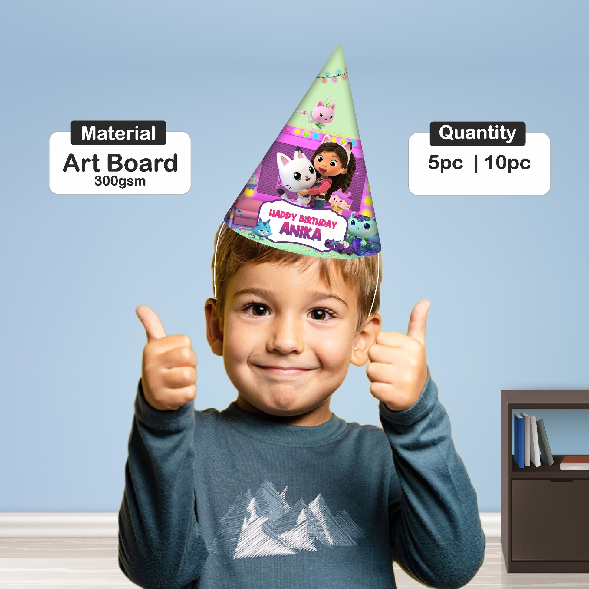 Get ready for a Cat-Tastic party with a personalized Gabby's Dollhouse birthday hat! These fun cone hats feature Gabby, Pandy Paws, and a colorful design, and can be customized with your child's name or age. They're the perfect accessory to make every little guest feel part of the magical Dollhouse celebration!