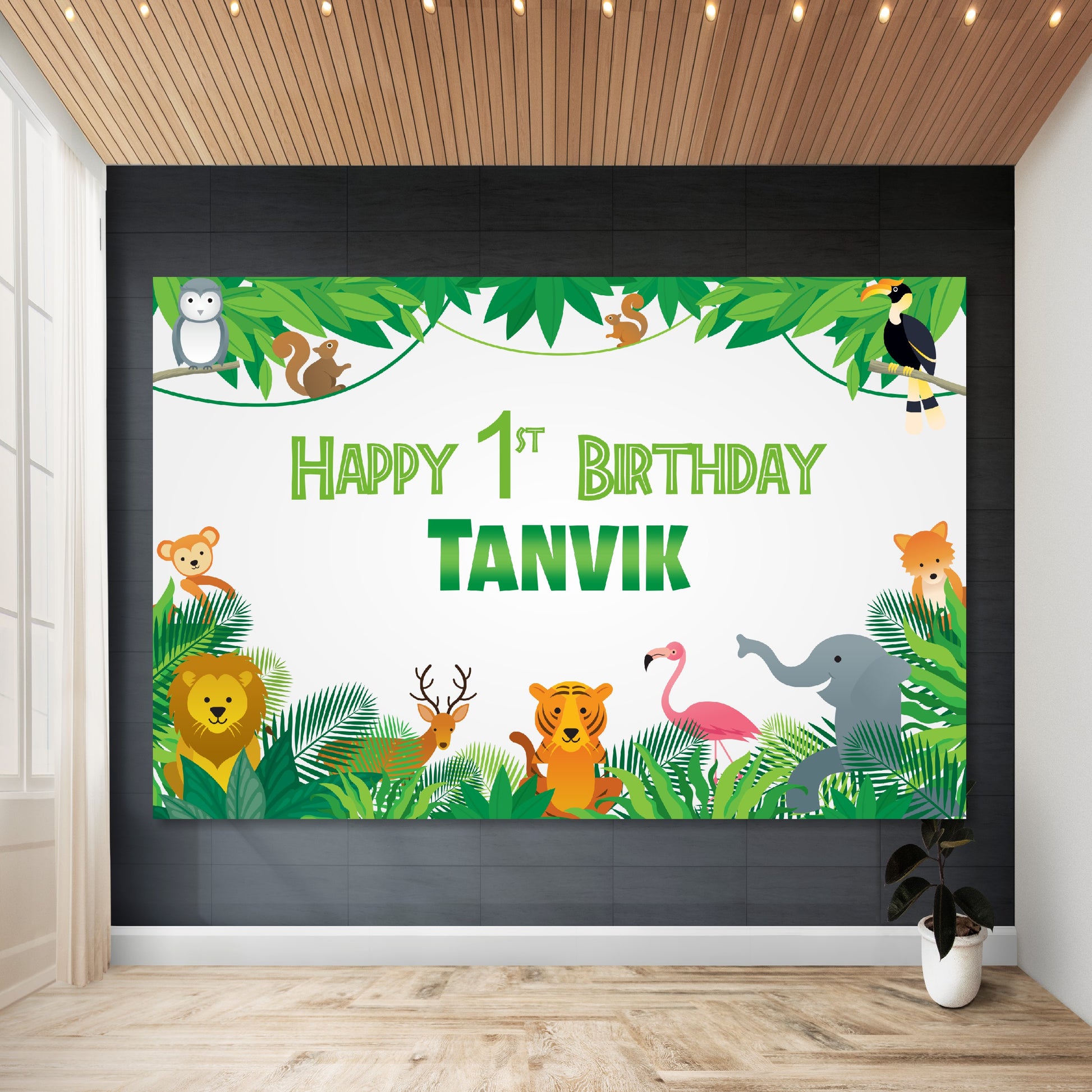Welcome to the Wild! Our personalized Jungle Adventure Birthday Banner features adorable cartoon safari animals like Simba/a baby lion, monkeys, elephants, and giraffes peeking through lush green leaves and vines. Customize it with your little explorer's name and age to create the perfect centerpiece for a wild and fun celebration!