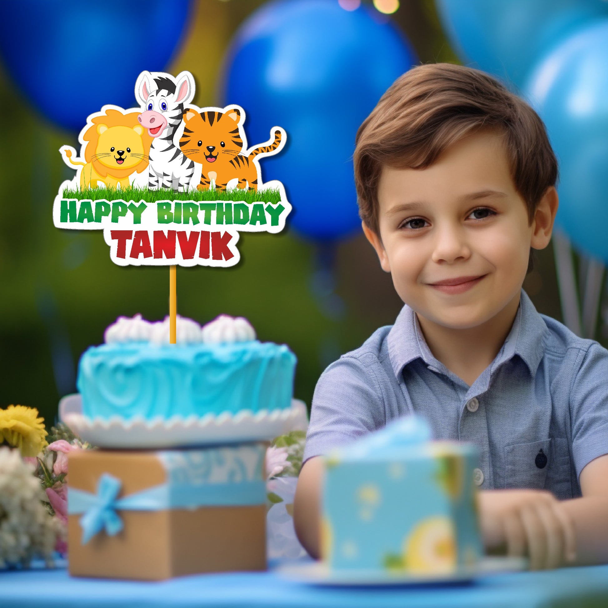 Crown your cake the King of the Jungle! Our personalized Jungle Safari Cake Topper is the perfect centerpiece for your birthday dessert. This vibrant, multi-layered topper features an adorable scene with charming safari animals (like a lion and a giraffe) peaking out from behind tropical leaves. The topper is prominently customized with your child's name and age, making it a cheerful, eye-catching focal point for your jungle-themed cake!