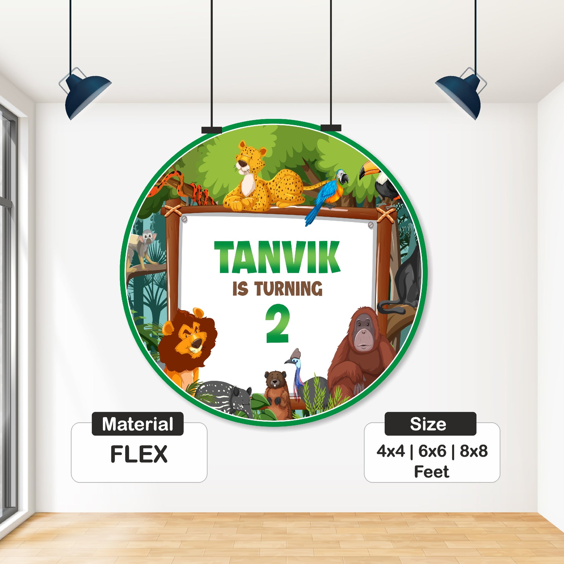 Welcome to the Wild! Our personalized Jungle Adventure Birthday Round Banner features adorable cartoon safari animals like Simba/a baby lion, monkeys, elephants, and giraffes peeking through lush green leaves and vines. Customize it with your little explorer's name and age to create the perfect centerpiece for a wild and fun celebration!