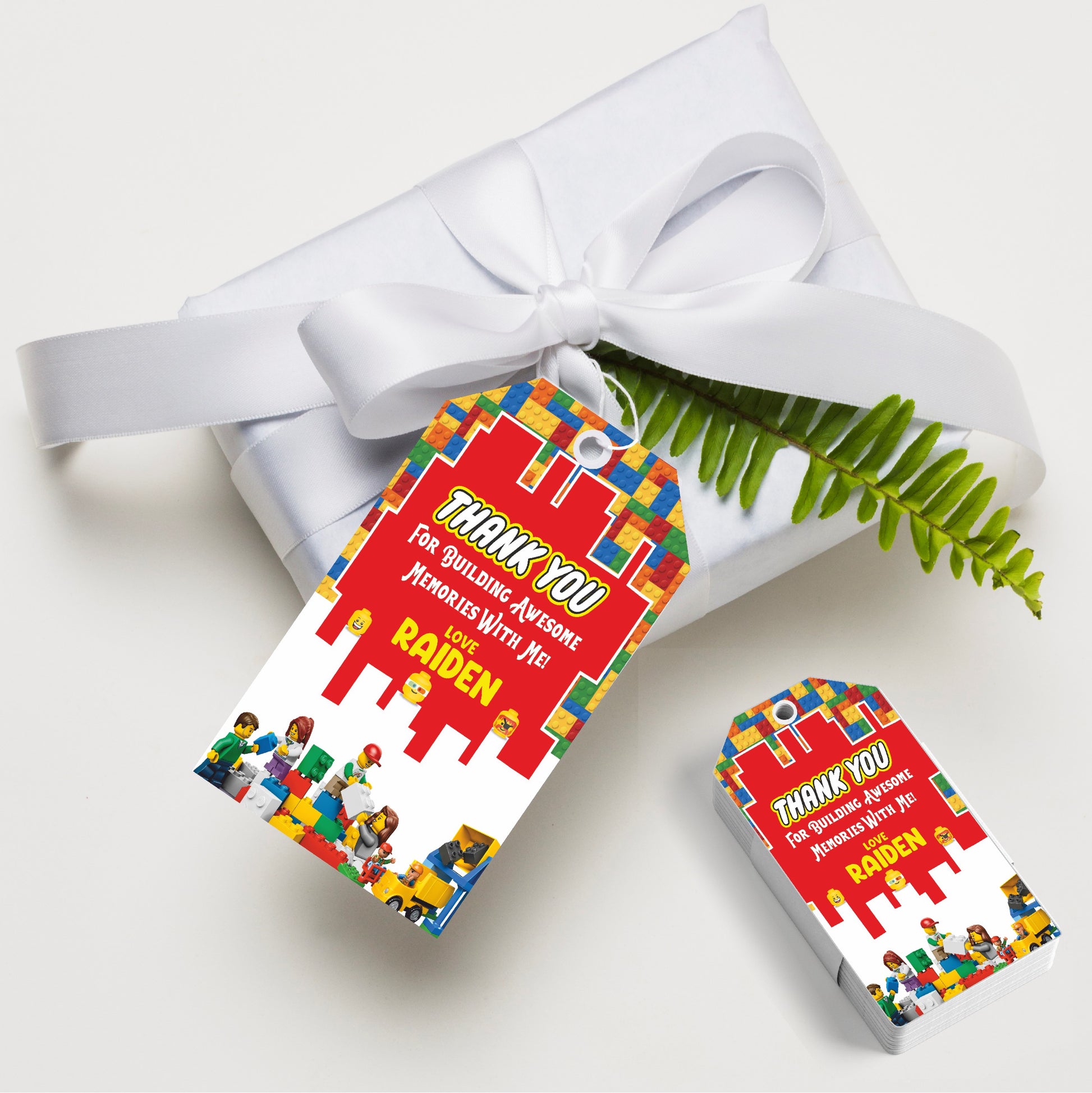 Thanks for building a great time! Our personalized LEGO thank you tags are the perfect little touch for your party favors. Featuring a fun, brick-inspired design, these tags can be customized with your child's name and a sweet message. They're a simple way to show your guests some love for celebrating their special day.