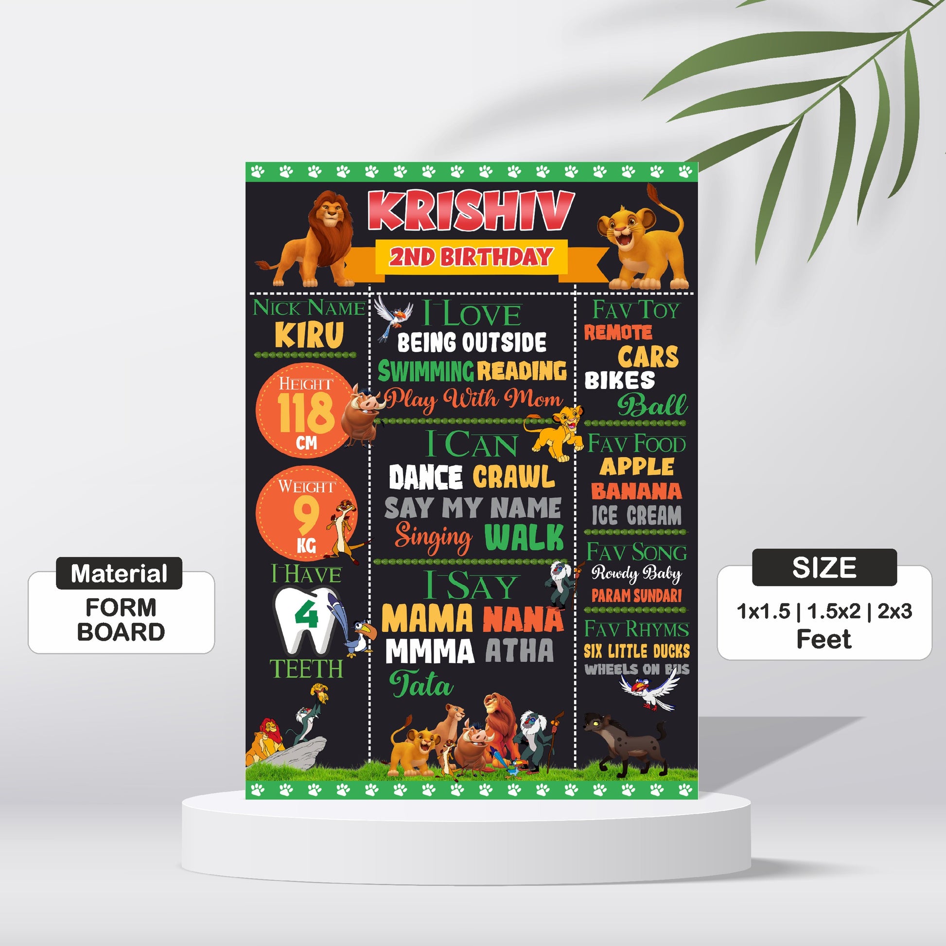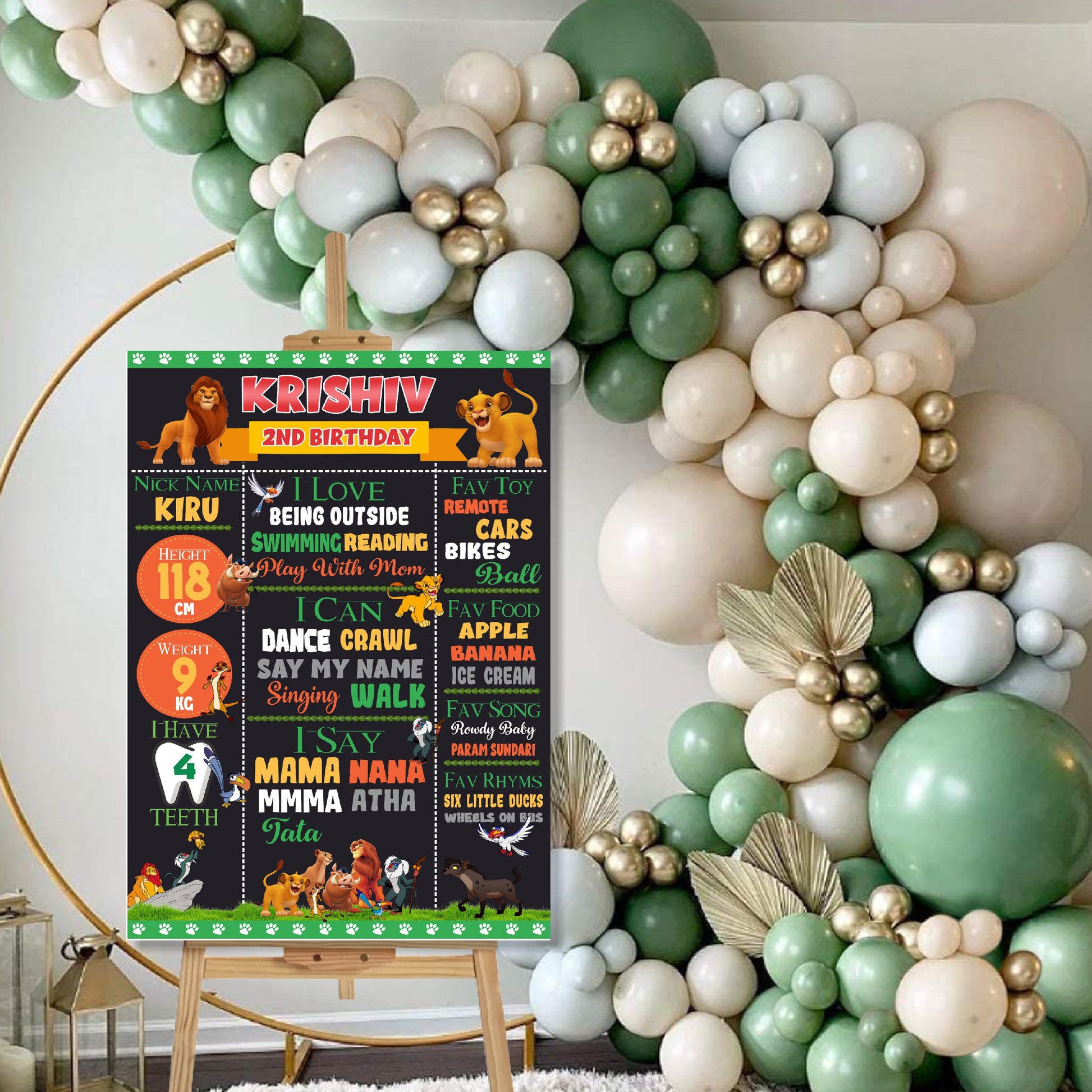 A roaring record of their royal year! This custom Lion King Chalkboard Sign is a charming way to display your child's favorite things and milestones. It features cute character icons and is clearly personalized with your child's name and age on a fun chalkboard background.