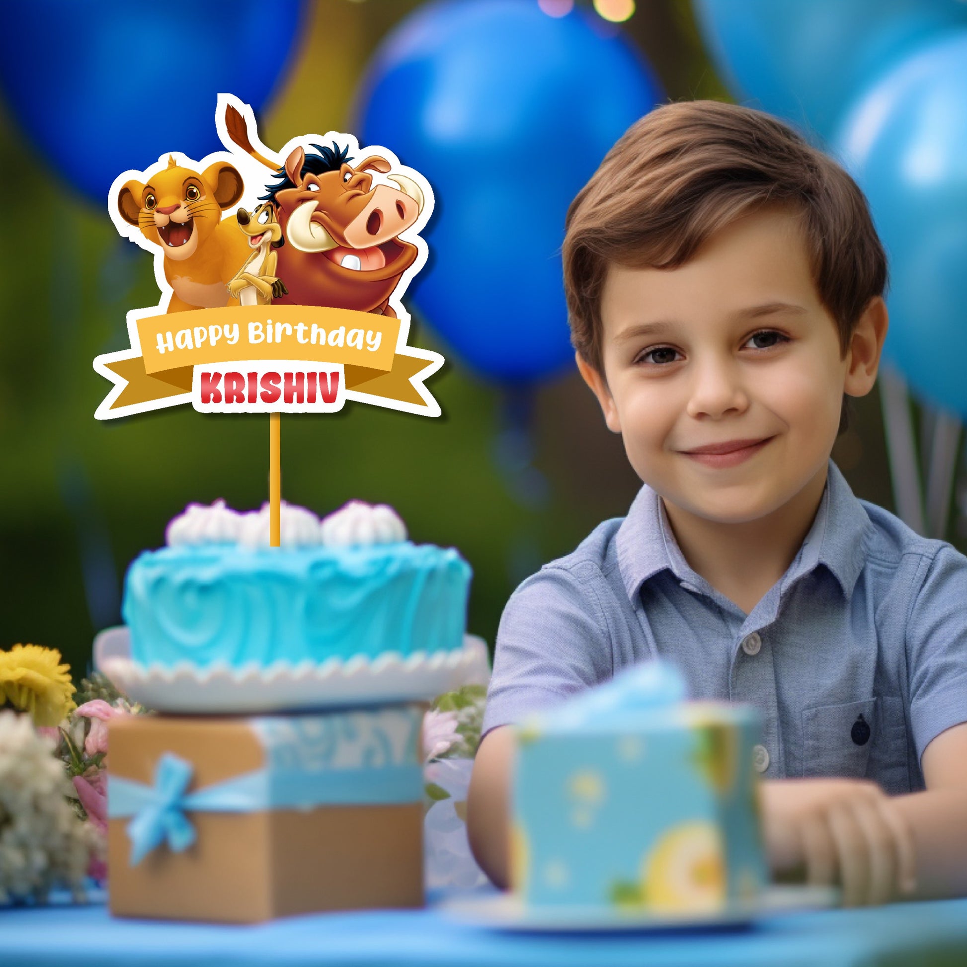 Crown your cake the King of the Jungle! Our personalized Lion King Cake Topper is the perfect centerpiece for your birthday dessert. This vibrant, multi-layered topper features an adorable scene with young Simba, Timon, and Pumbaa nestled among tropical leaves and flowers. The topper is prominently customized with your child's name and age, making it a cheerful, eye-catching focal point for your Pride Lands celebration!