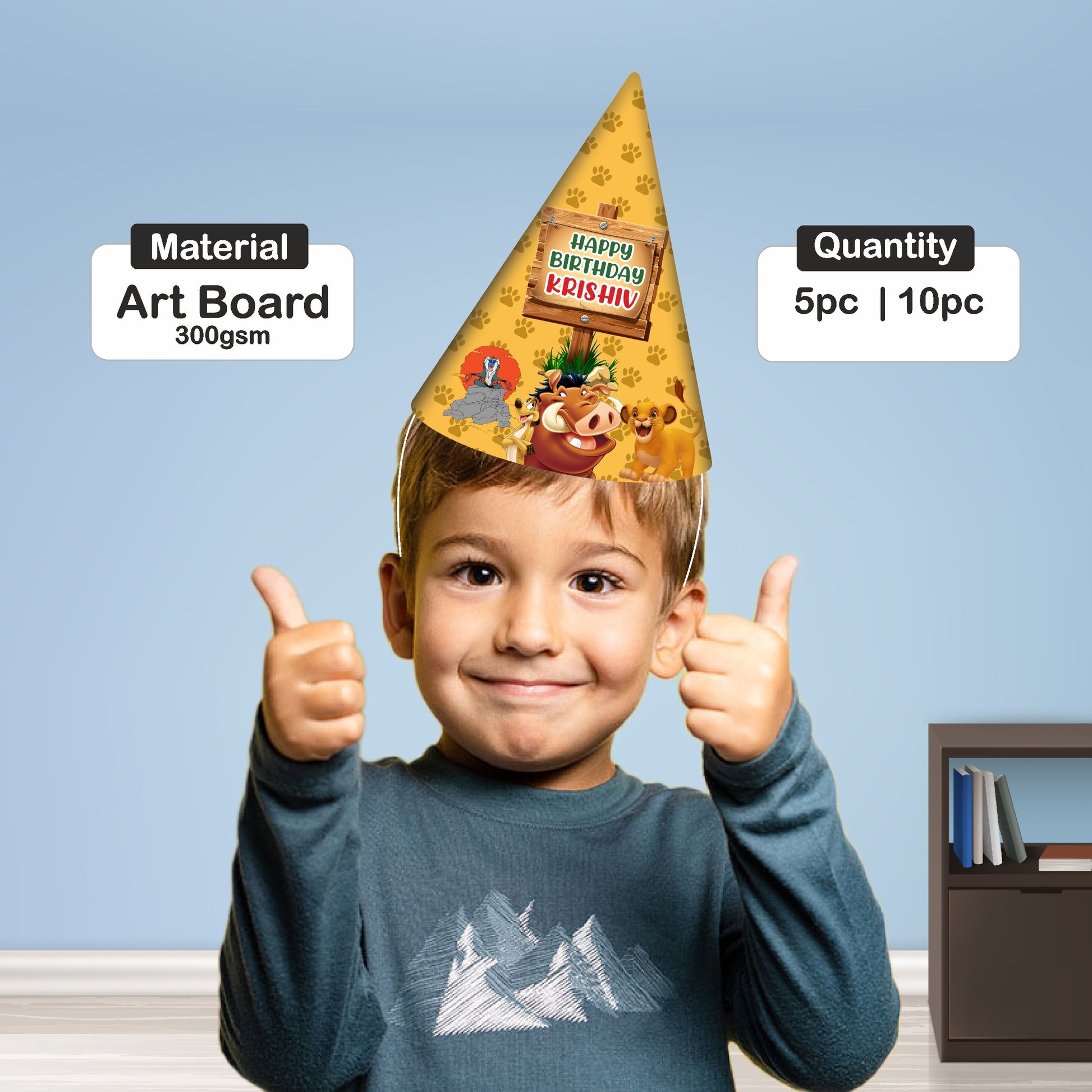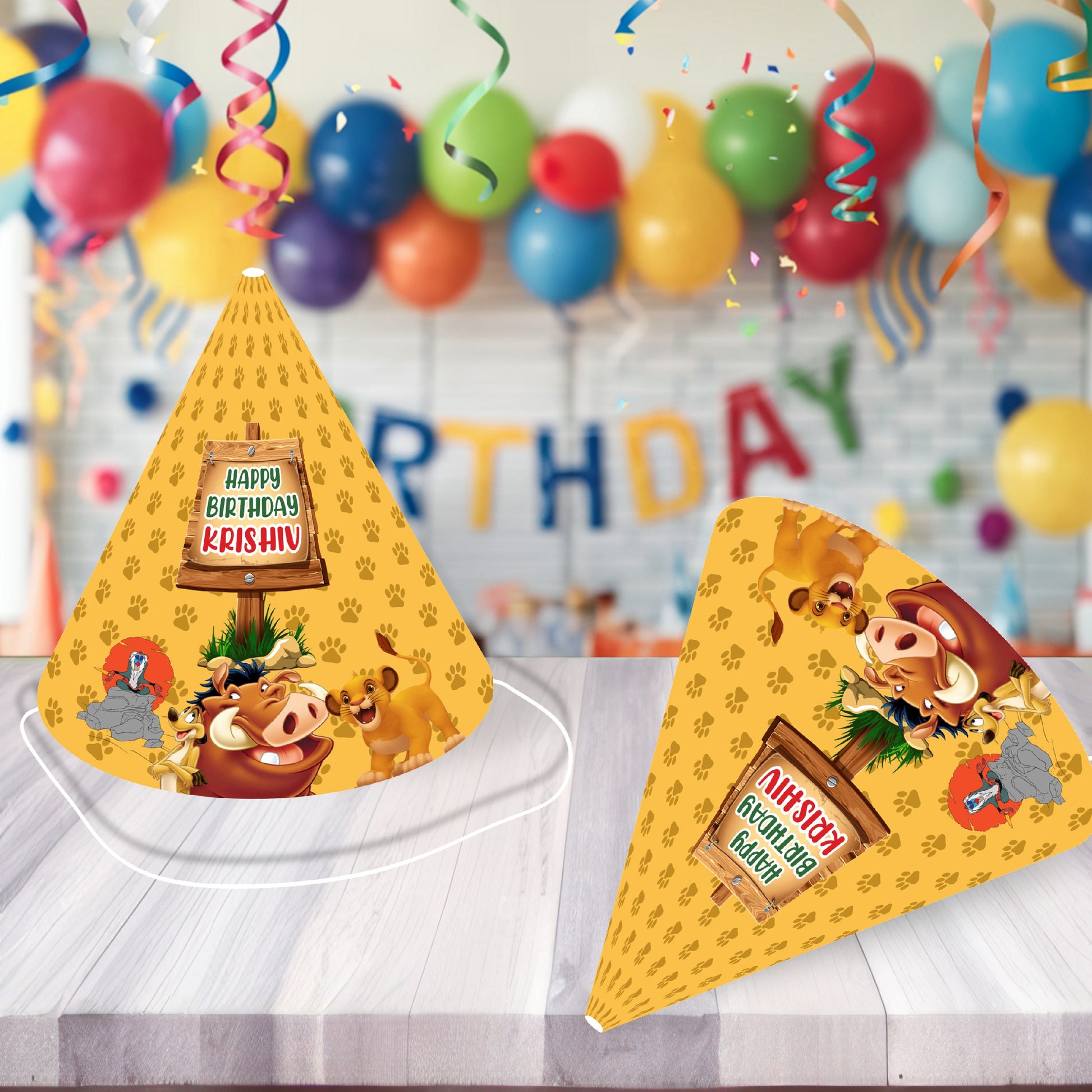 Top off the royal celebration! Our personalized Lion King Birthday Hats are classic party cones decked out for a trip to the Pride Lands. Each hat is covered in vibrant animal prints (like a lion mane or spots) and topped with a fun, leafy pom-pom. The front of the hat is customized with the birthday child's name and age, ensuring the King or Queen of the party stands out in every photo!