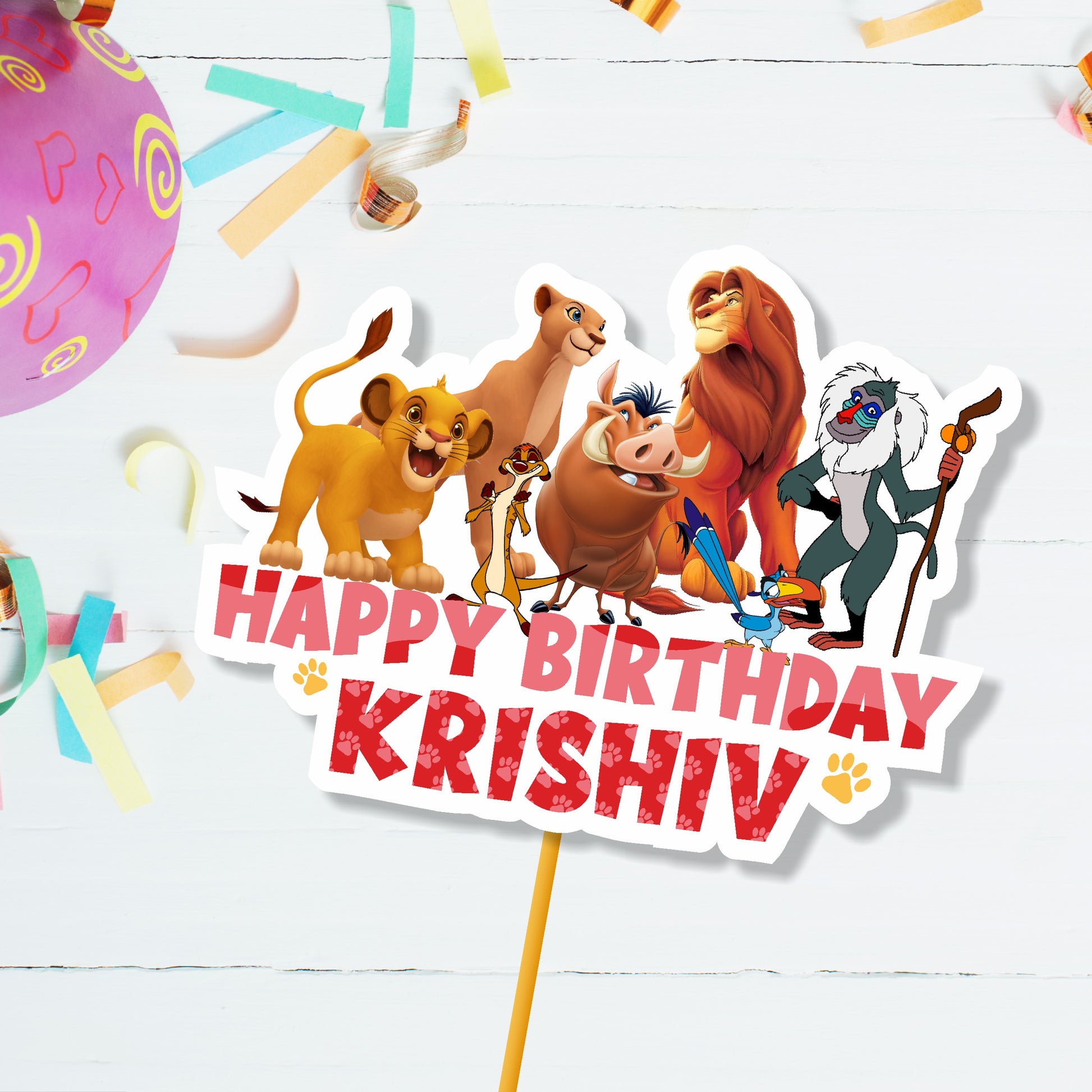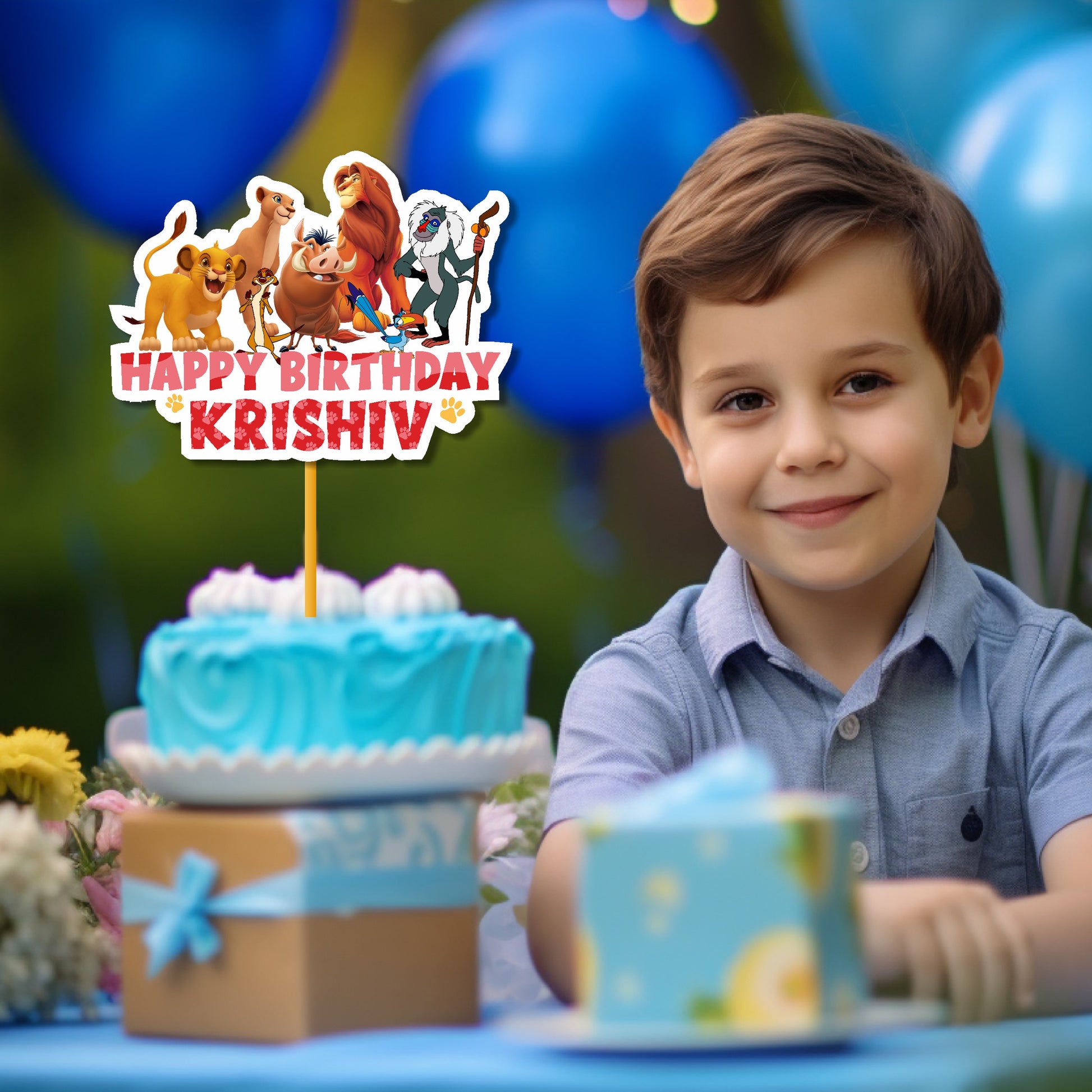 Crown your cake the King of the Jungle! Our personalized Lion King Cake Topper is the perfect centerpiece for your birthday dessert. This vibrant, multi-layered topper features an adorable scene with young Simba, Timon, and Pumbaa nestled among tropical leaves and flowers. The topper is prominently customized with your child's name and age, making it a cheerful, eye-catching focal point for your Pride Lands celebration!