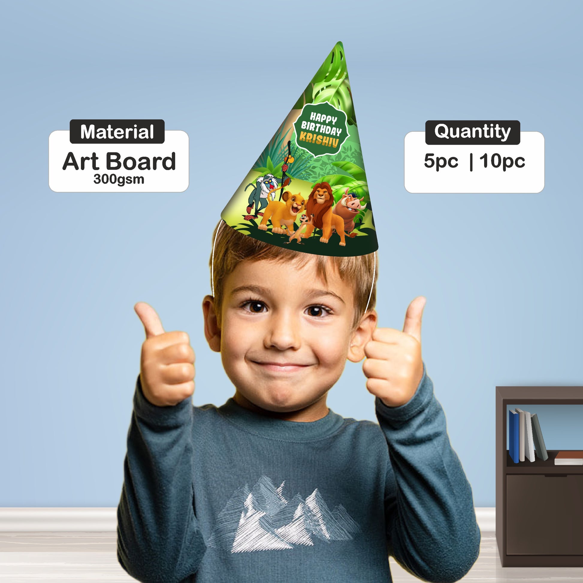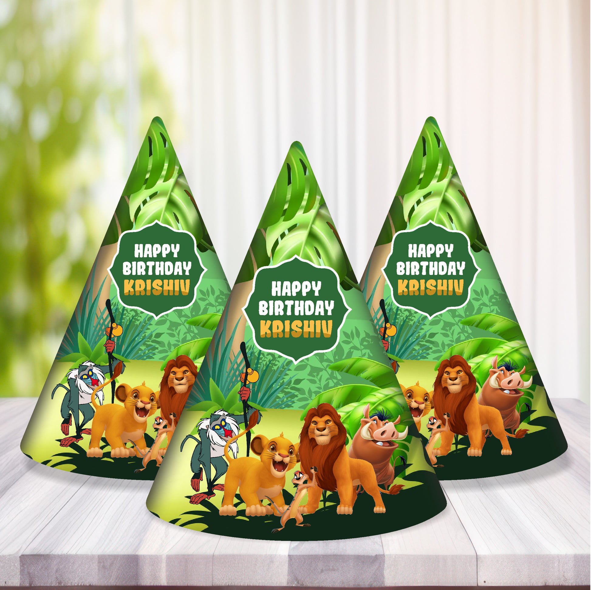 Top off the royal celebration! Our personalized Lion King Birthday Hats are classic party cones decked out for a trip to the Pride Lands. Each hat is covered in vibrant animal prints (like a lion mane or spots) and topped with a fun, leafy pom-pom. The front of the hat is customized with the birthday child's name and age, ensuring the King or Queen of the party stands out in every photo!