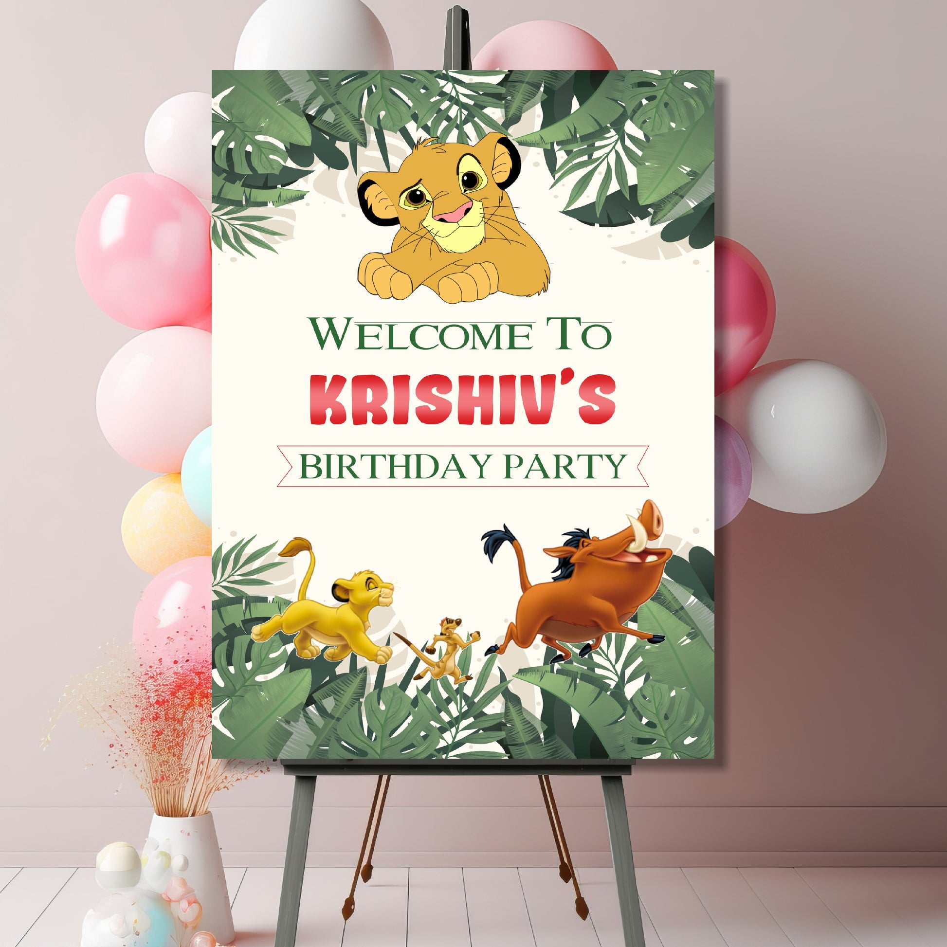 Welcome to the Wildest Kingdom! Our personalized Lion King Welcome Board is the perfect way to greet your guests and set the Hakuna Matata mood! This vibrant poster features young Simba, Timon, and Pumbaa waving happily from the savanna. The sign is boldly customized with a friendly greeting: "Welcome to [Child's Name]'s [Age]th Birthday Celebration!" This eye-catching board sets a cheerful, adventurous tone right at the party entrance.