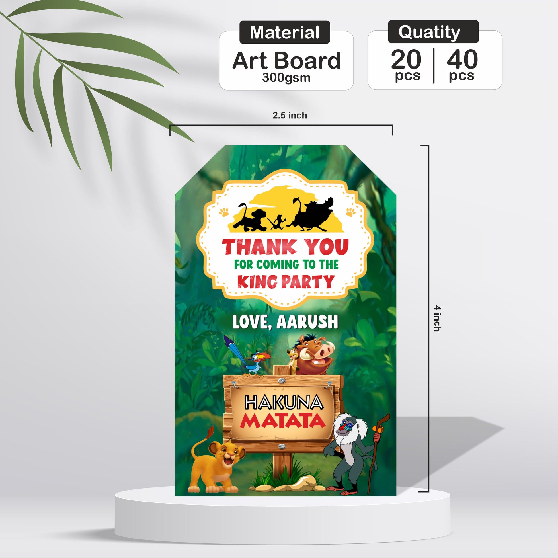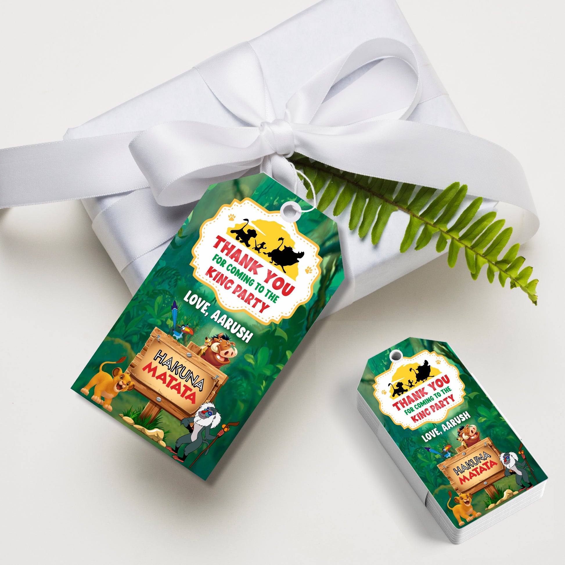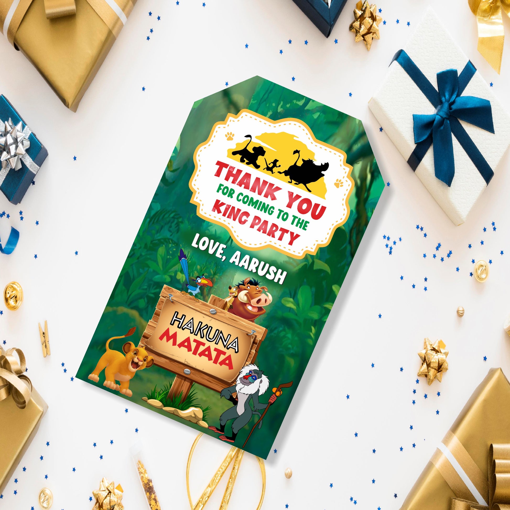 Complete the royal favor bags! Our custom Lion King Thank You Tags are designed to look like elegant, rustic savanna leaves or tribal carvings. They feature rich, warm colors, animal print accents, and are fully personalized with the birthday child's name, age, and a heartfelt thank you message. These high-quality tags ensure your guests leave with a memorable keepsake from the royal celebration!