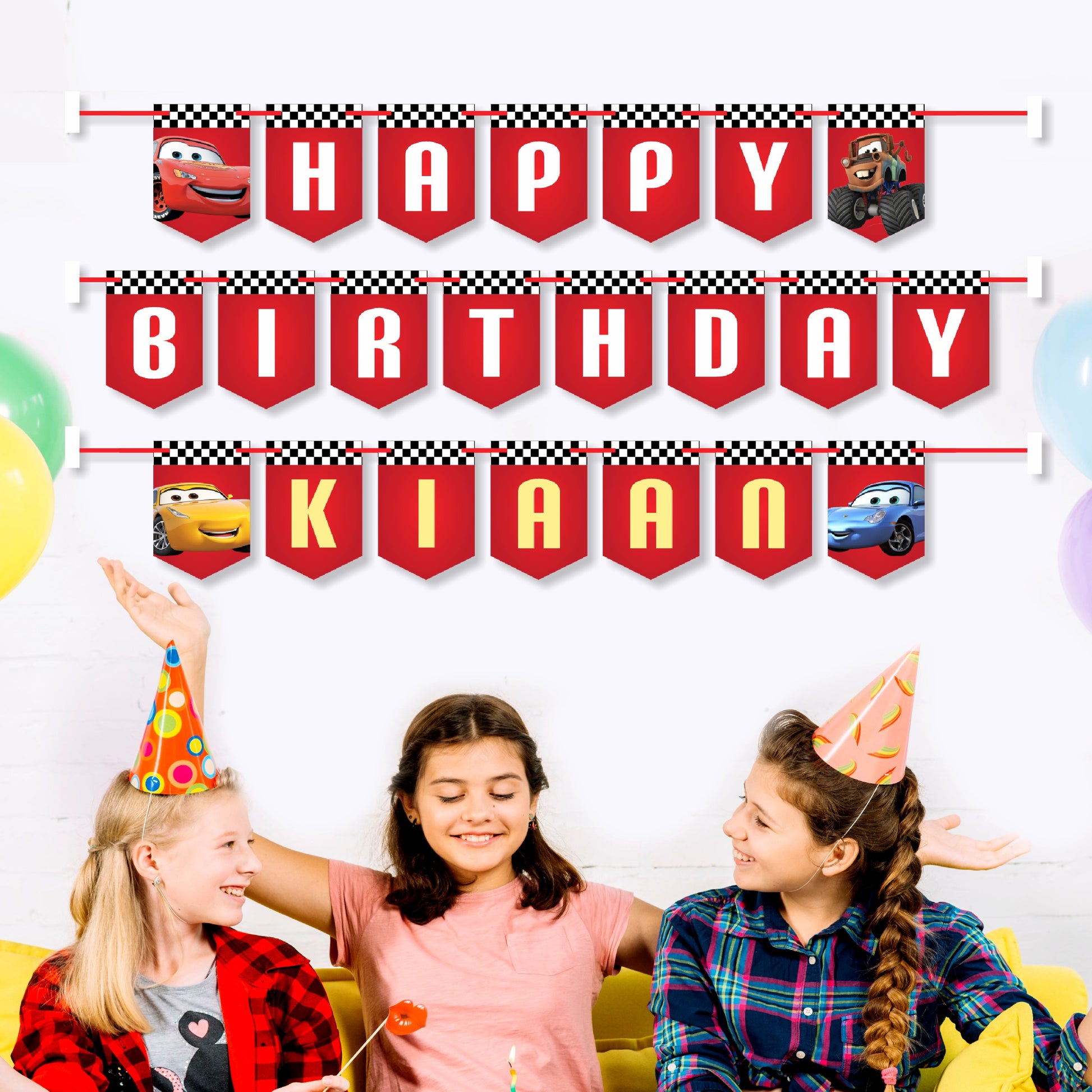 Make the little racer feel like the champion of the celebration with a personalized Lightning McQueen Name Bunting! This awesome banner features vibrant flags with Lightning McQueen, Mater, and high-speed racing graphics, perfectly spelling out your child's name. It's the ultimate decoration to bring the energy and excitement of the racetrack right to your party!