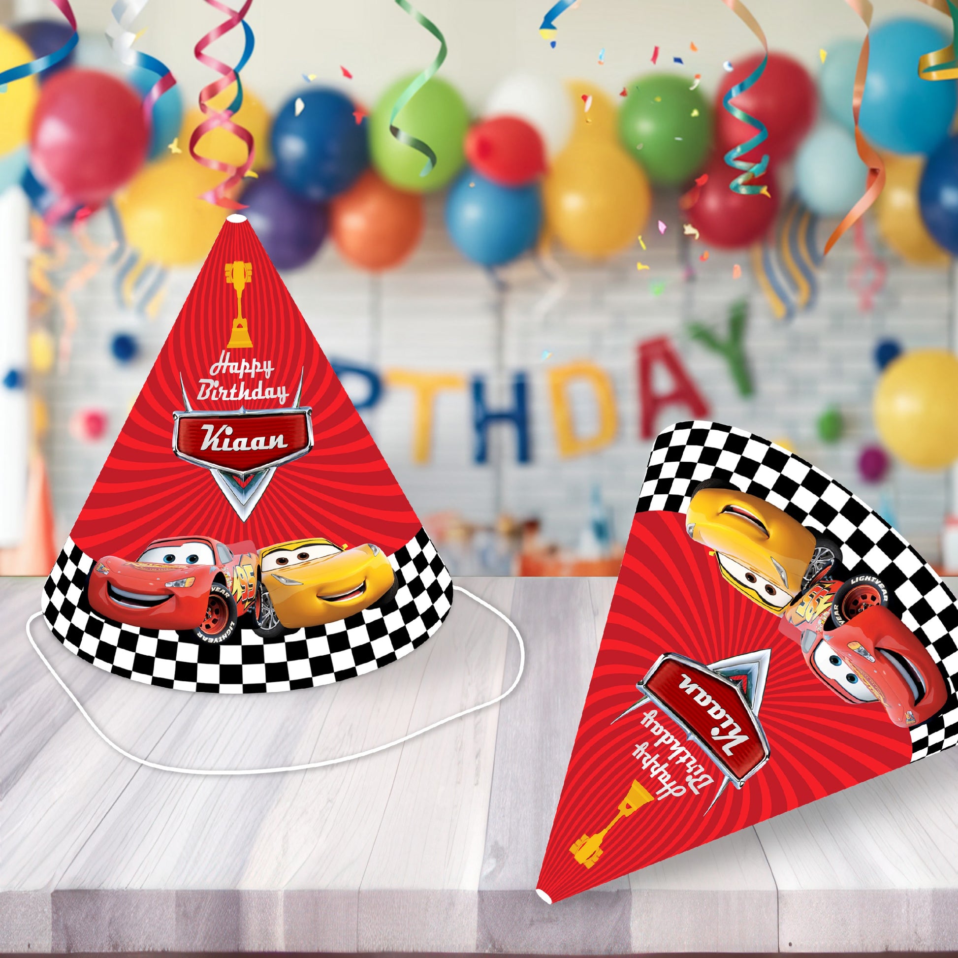 Get ready for an epic championship with a personalized Lightning McQueen birthday hat! These fun cone hats feature action-packed graphics of your favorite race cars and can be customized with your child's name or age. They're the perfect accessory to make every little guest feel like a champion racer ready to hit the track!