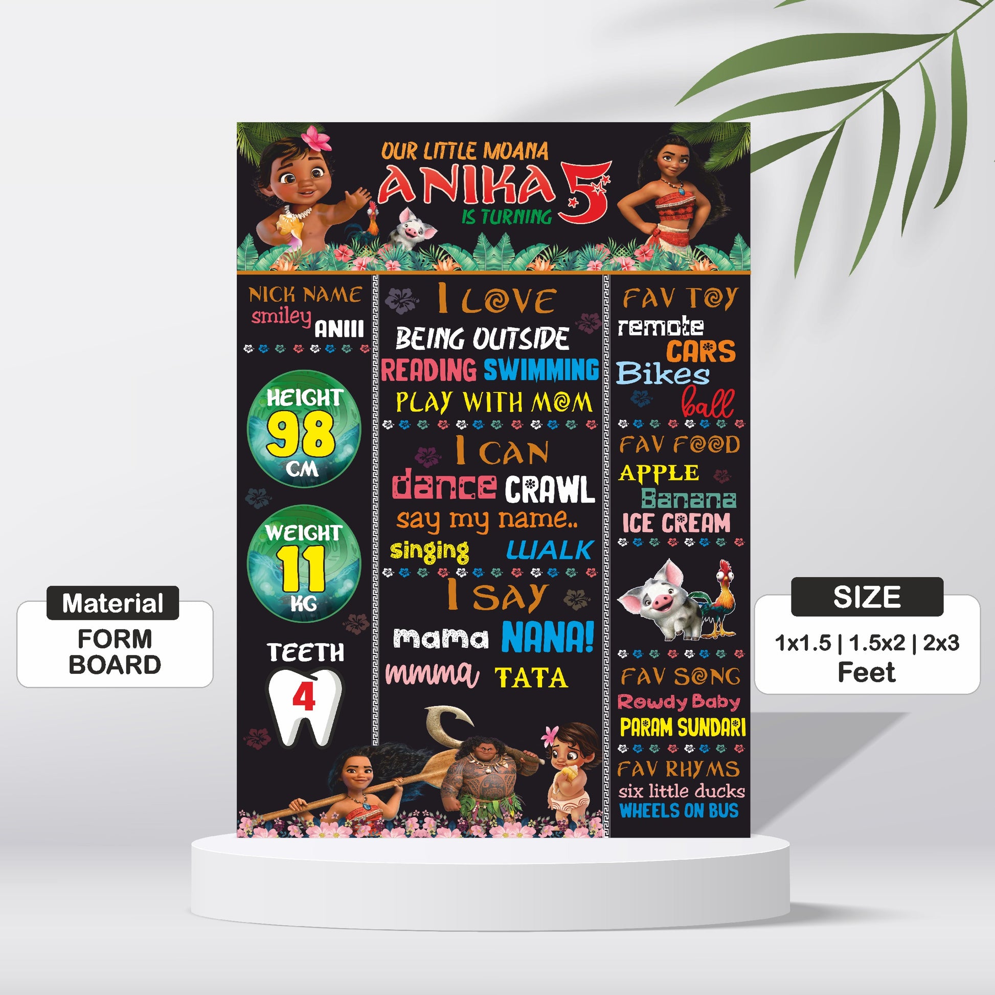 Capture all their special stats from the voyage! Our personalized Moana birthday chalkboard features Moana, Maui, and a tropical design that highlights all the things that make your little one unique—from their favorite songs and biggest adventures to their age and height. It's an adorable, island-style way to capture a snapshot of your party star!