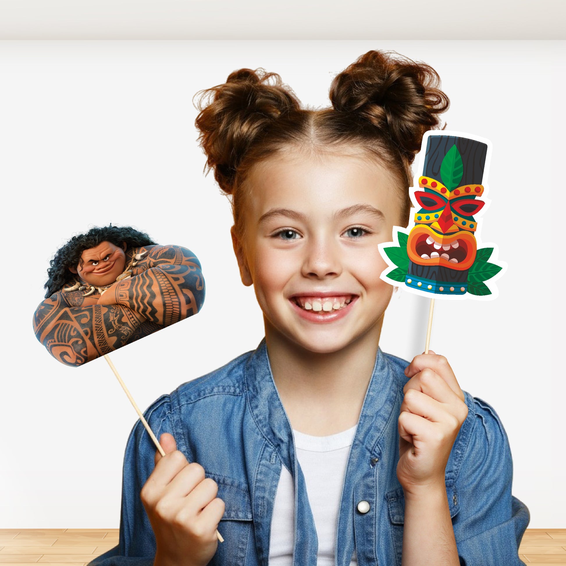 Time for an epic photo journey! Our personalized Moana photo booth props are the perfect addition to any party. The set includes a variety of fun, custom cutouts like Maui's hook, Pua the pig, Heihei the chicken, tropical flowers, and speech bubbles with custom island phrases. They're a super fun way to capture memorable, silly moments from your adventure!