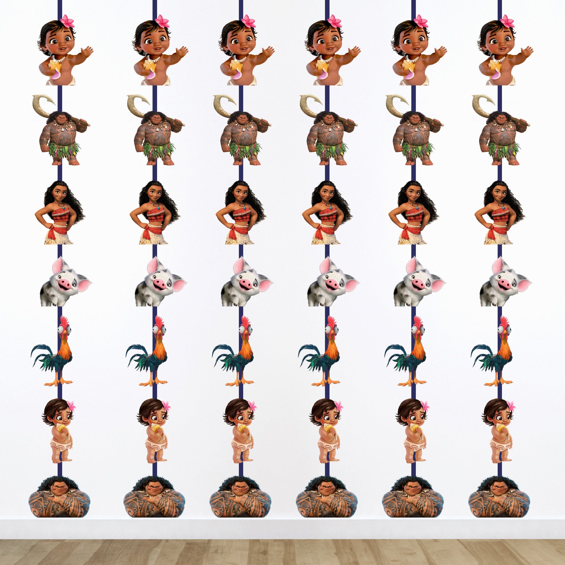 Add some whimsical movement to your party with personalized Moana-themed Hanging Danglers! These decorations feature Moana, Maui, and other island friends on colorful spirals, perfect for hanging from the ceiling. bringing the playful spirit of Motunui right into your party space!