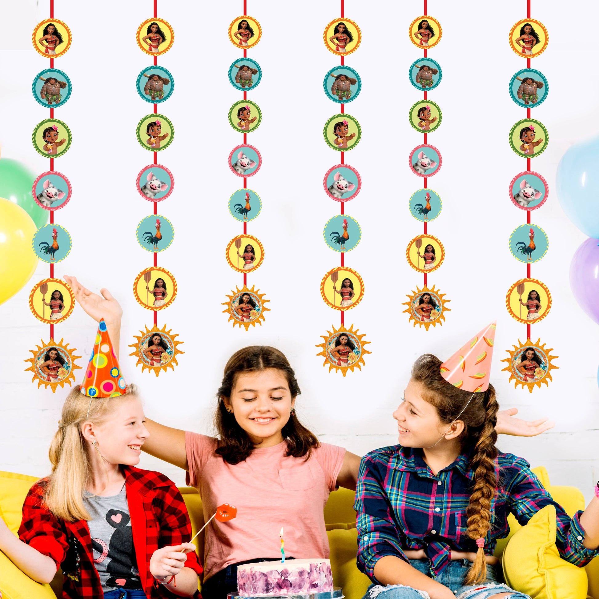 Add some whimsical movement to your party with personalized Moana-themed Hanging Danglers! These decorations feature Moana, Maui, and other island friends on colorful spirals, perfect for hanging from the ceiling. bringing the playful spirit of Motunui right into your party space!
