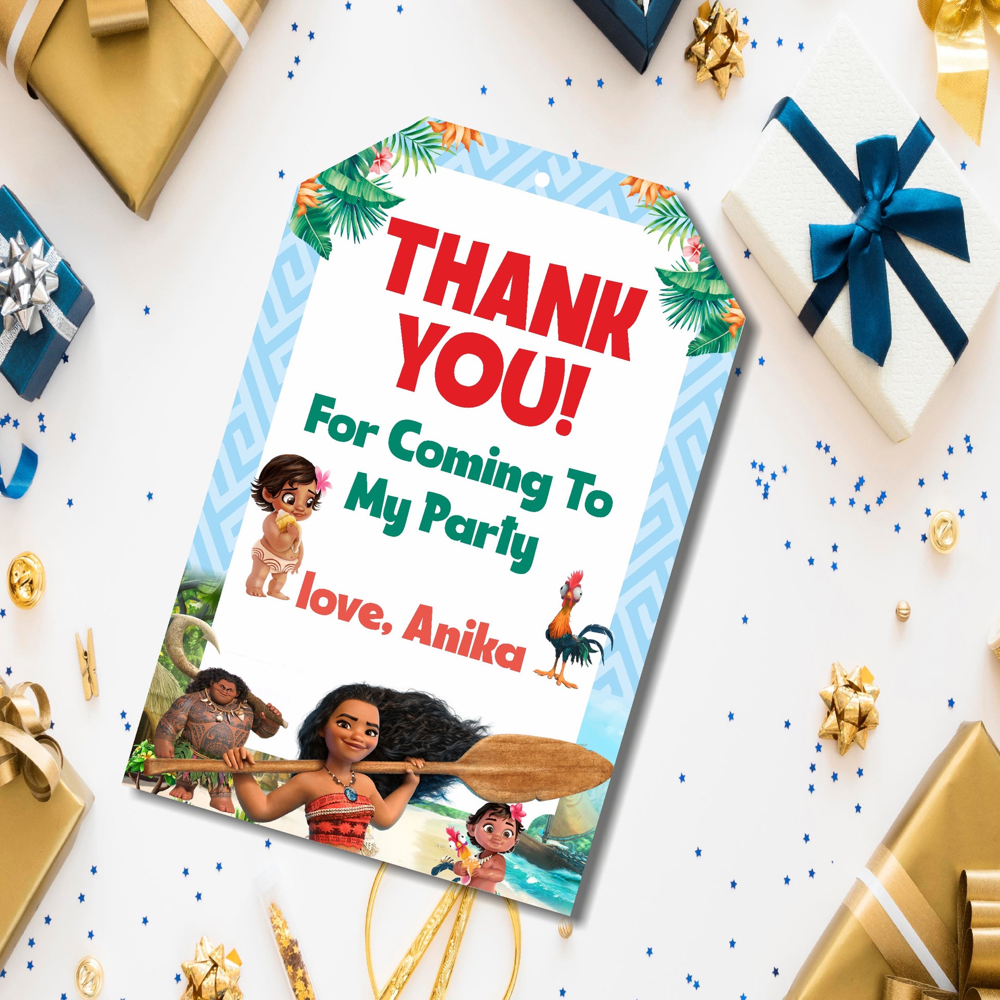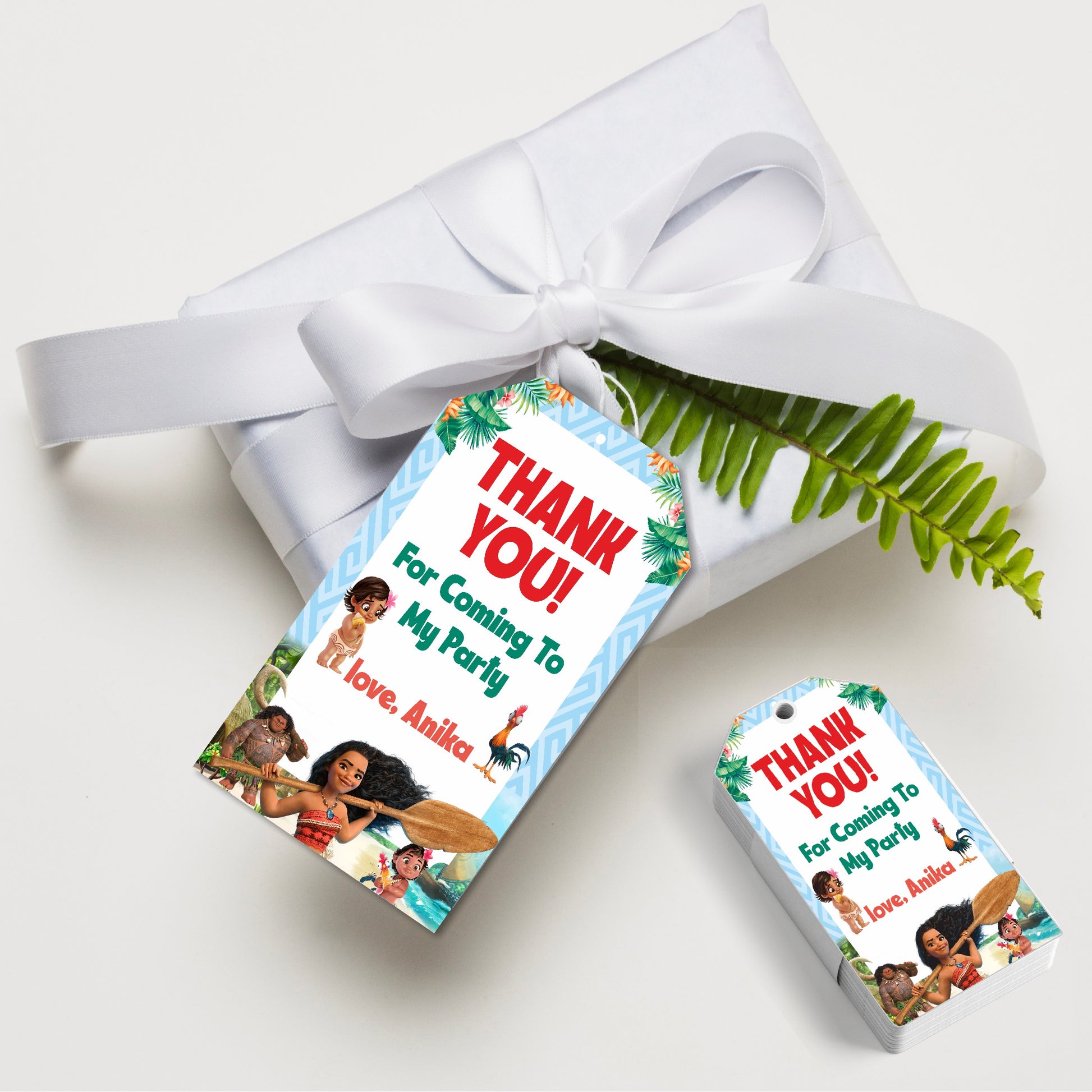Add a finishing wave of adventure to your favors with personalized Moana birthday tags! Featuring Moana, Maui, and tropical designs, these tags are the perfect way to label your party bags or gifts. Customize them with a warm "Thank You" message and your child's name for a charming, island-style touch!