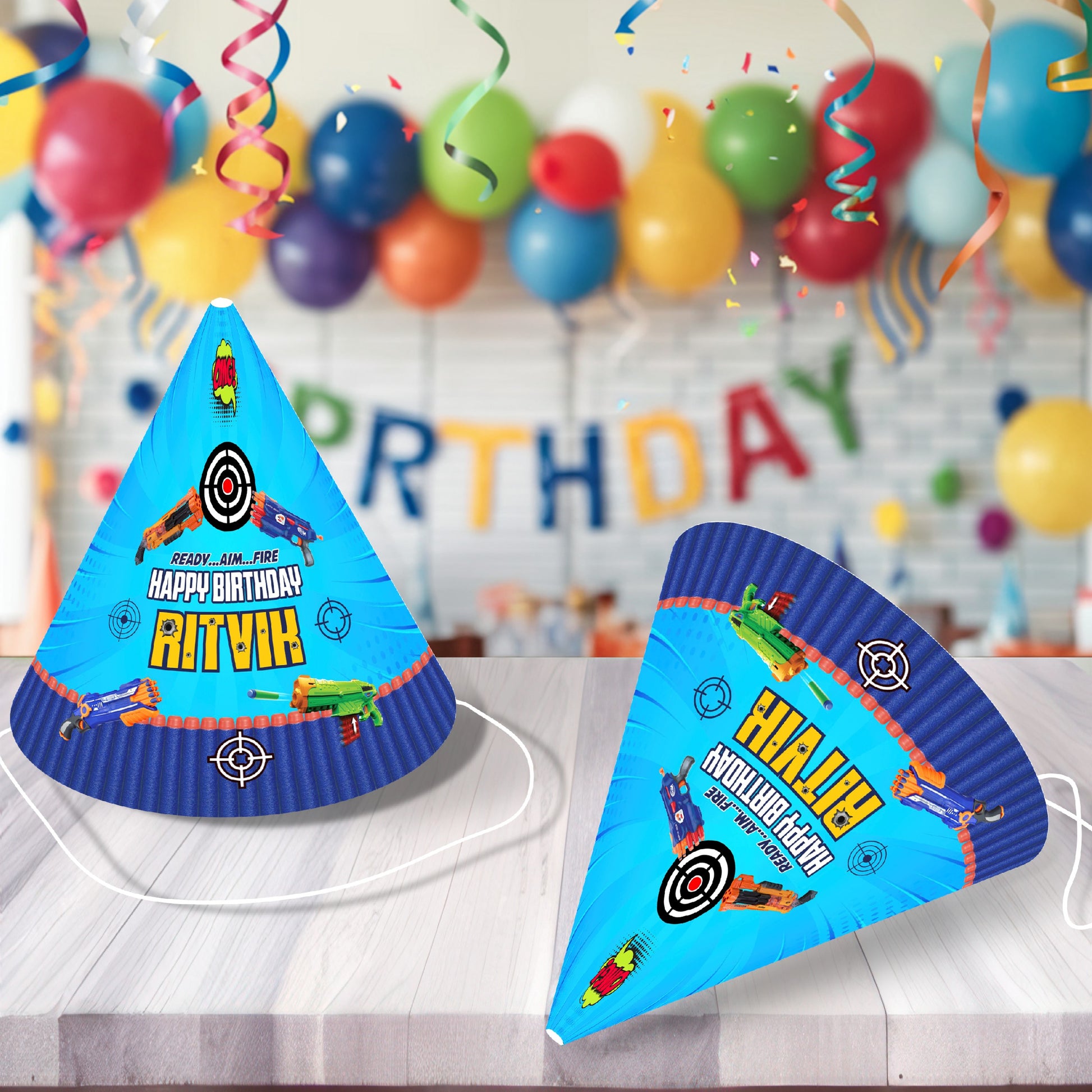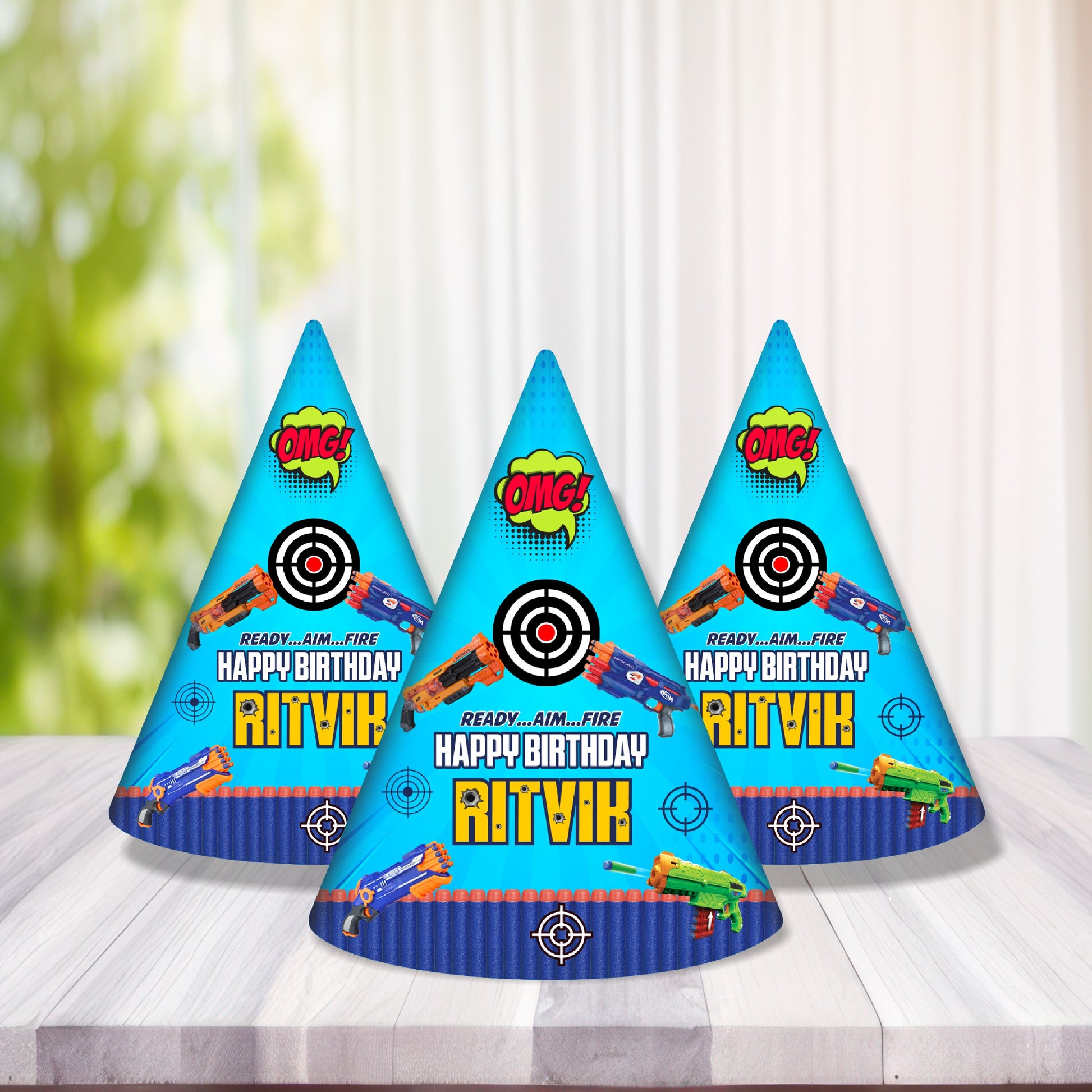 Gear up, Commander! Get ready for the foam-flinging action with a personalized Nerf Gun birthday hat! These fun cone hats feature action-packed graphics of blasters and targets and can be customized with your child's name or age. They're the perfect accessory to make every little guest feel like a member of the elite squad and ready for the epic battle!