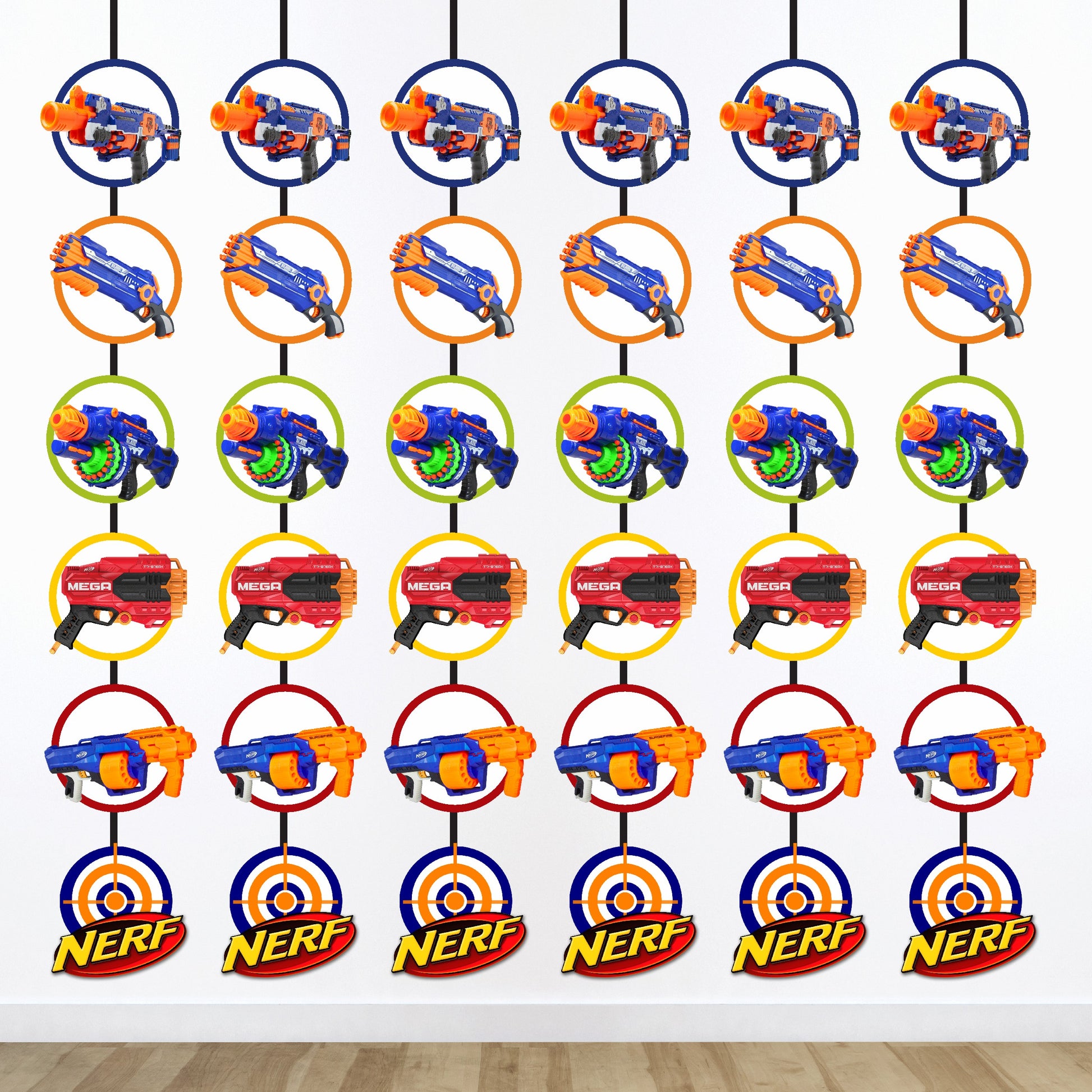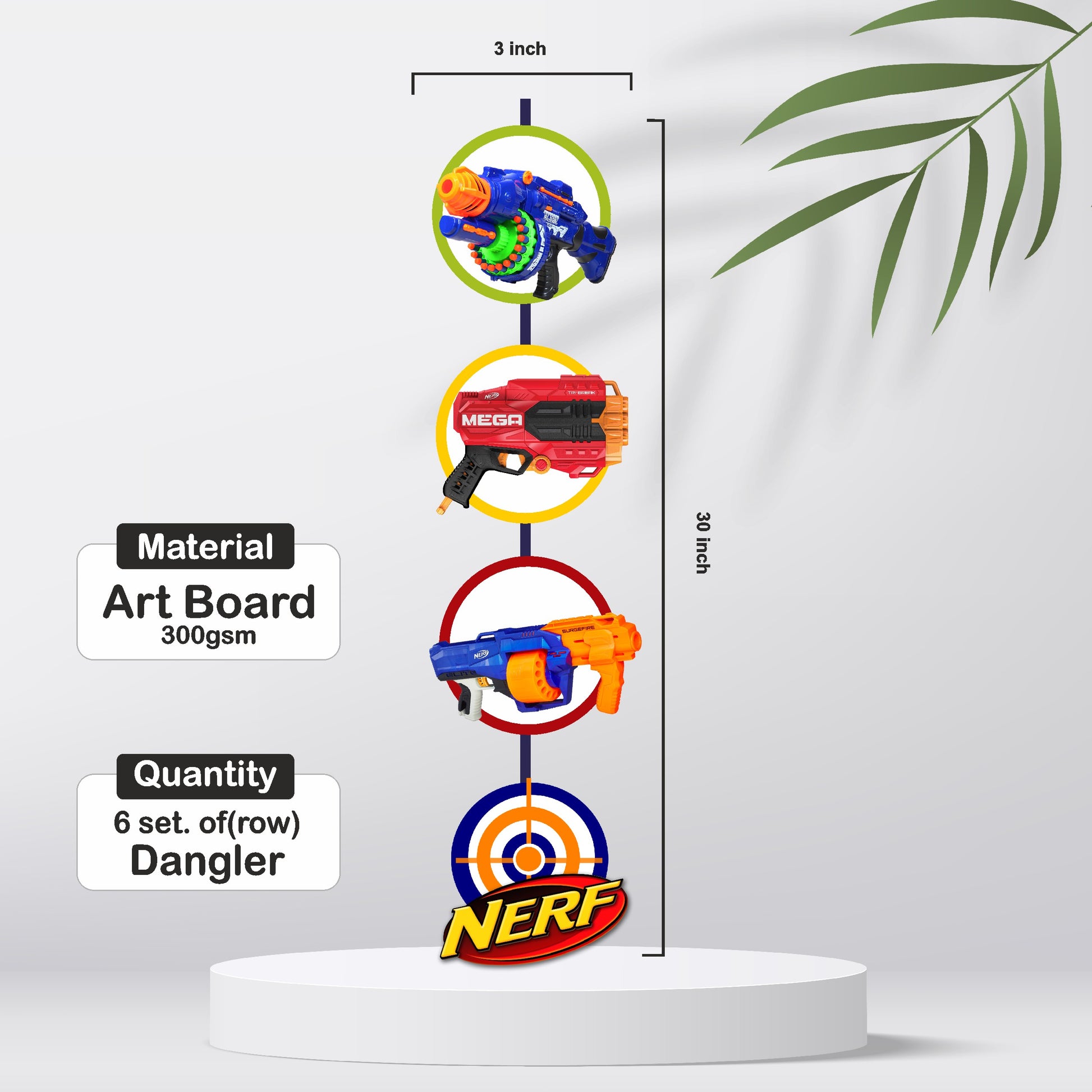 Add some fast-flying fun to your party with personalized Nerf Hanging Danglers! These decorations feature awesome cutouts of blasters, bright foam darts, and target bulls-eyes on colorful spirals, perfect for hanging from the ceiling. signaling to all your recruits that the battle zone is open!