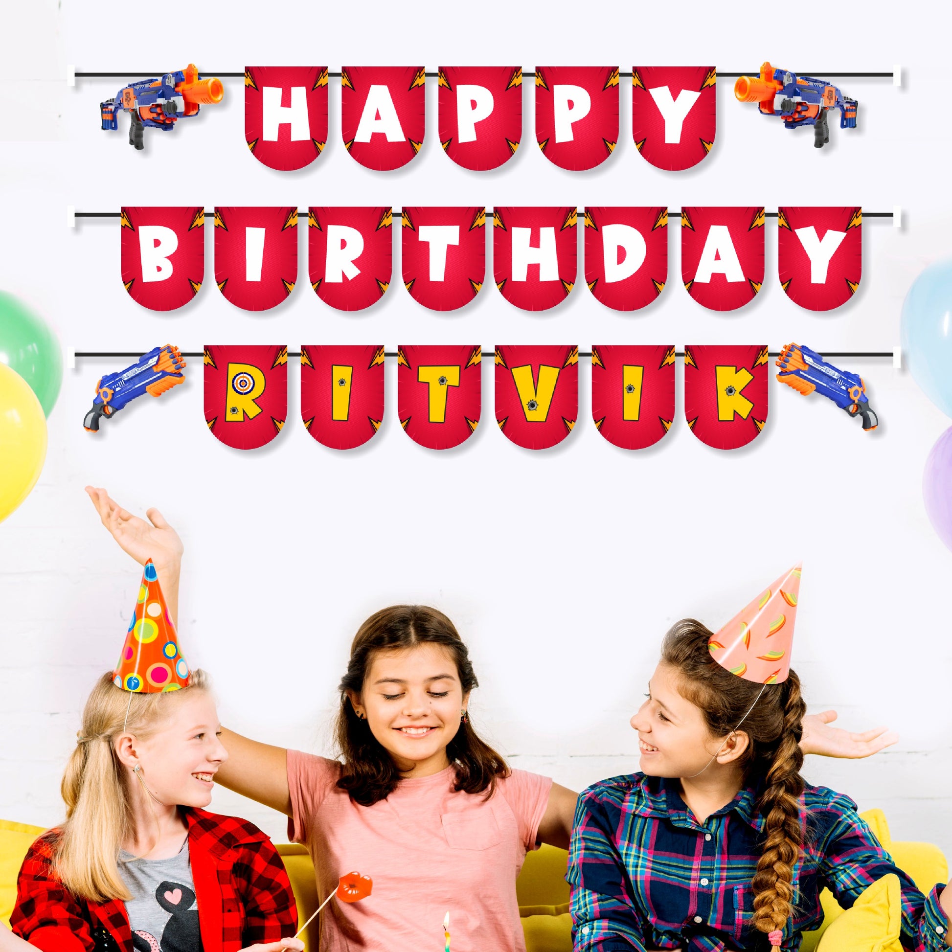 Make the little commander feel like the star of the mission with a personalized Nerf Gun Name Bunting! This action-packed banner features flags with blasters, targets, and foam darts perfectly spelling out your child's name. It's the ultimate decoration to bring the energy and excitement of the foam battle right to your party!