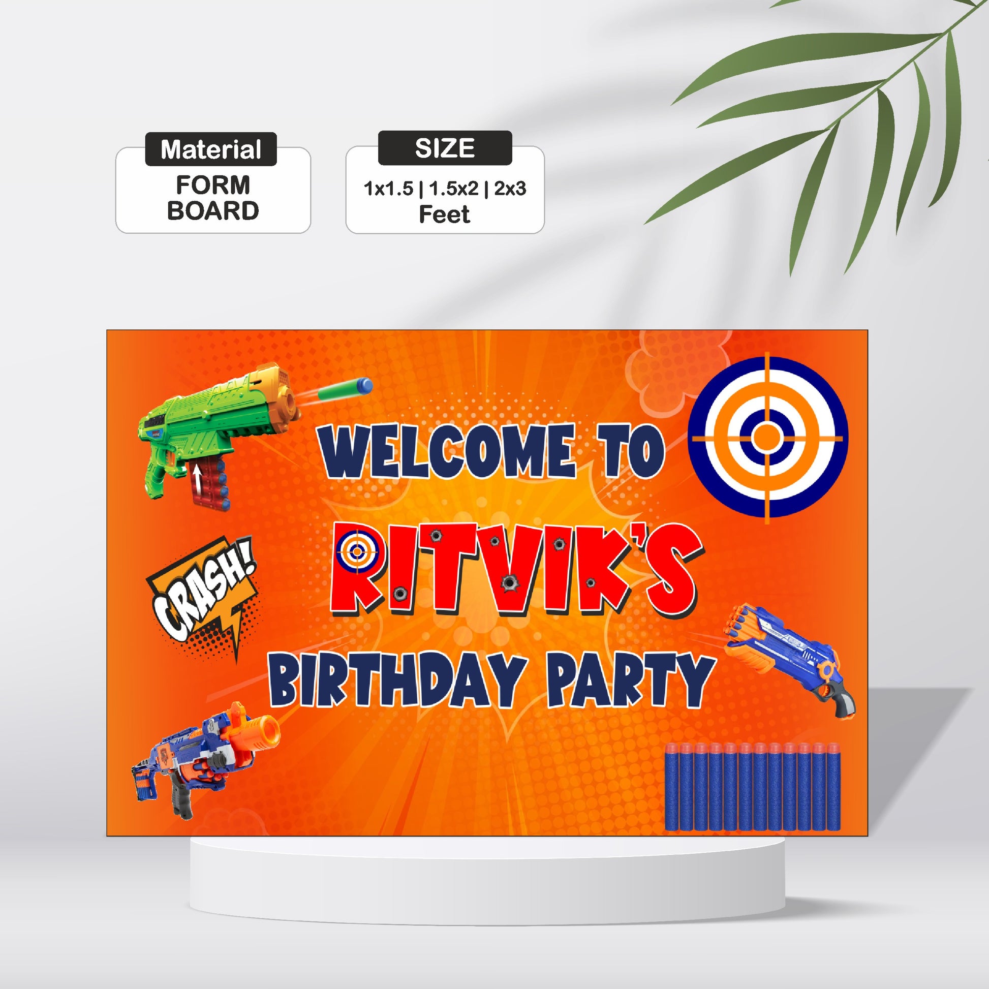Welcome to the Battle Zone! Start the mission with a custom Nerf-themed welcome board. This vibrant sign is personalized with your child's name and age and designed with high-quality, colorful graphics of the Nerf logo and target practice areas. It’s a dynamic and unique first impression that perfectly sets the tactical, high-energy tone for the birthday party!