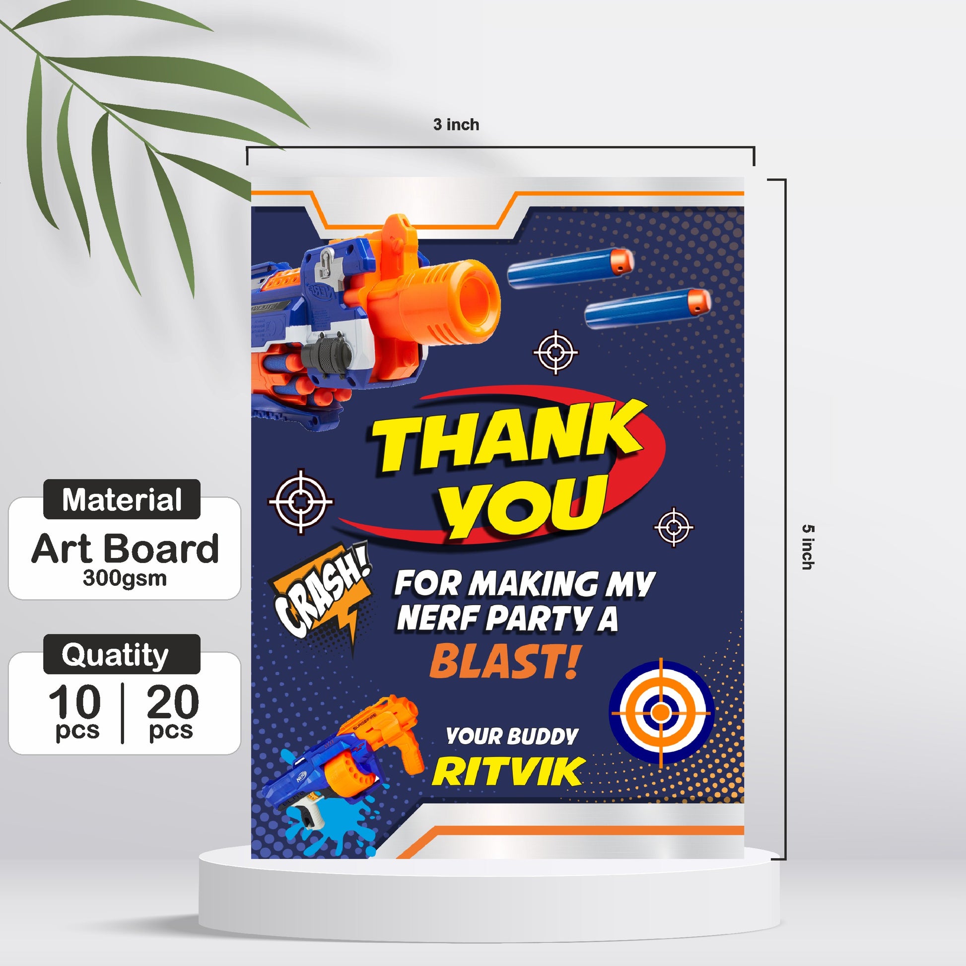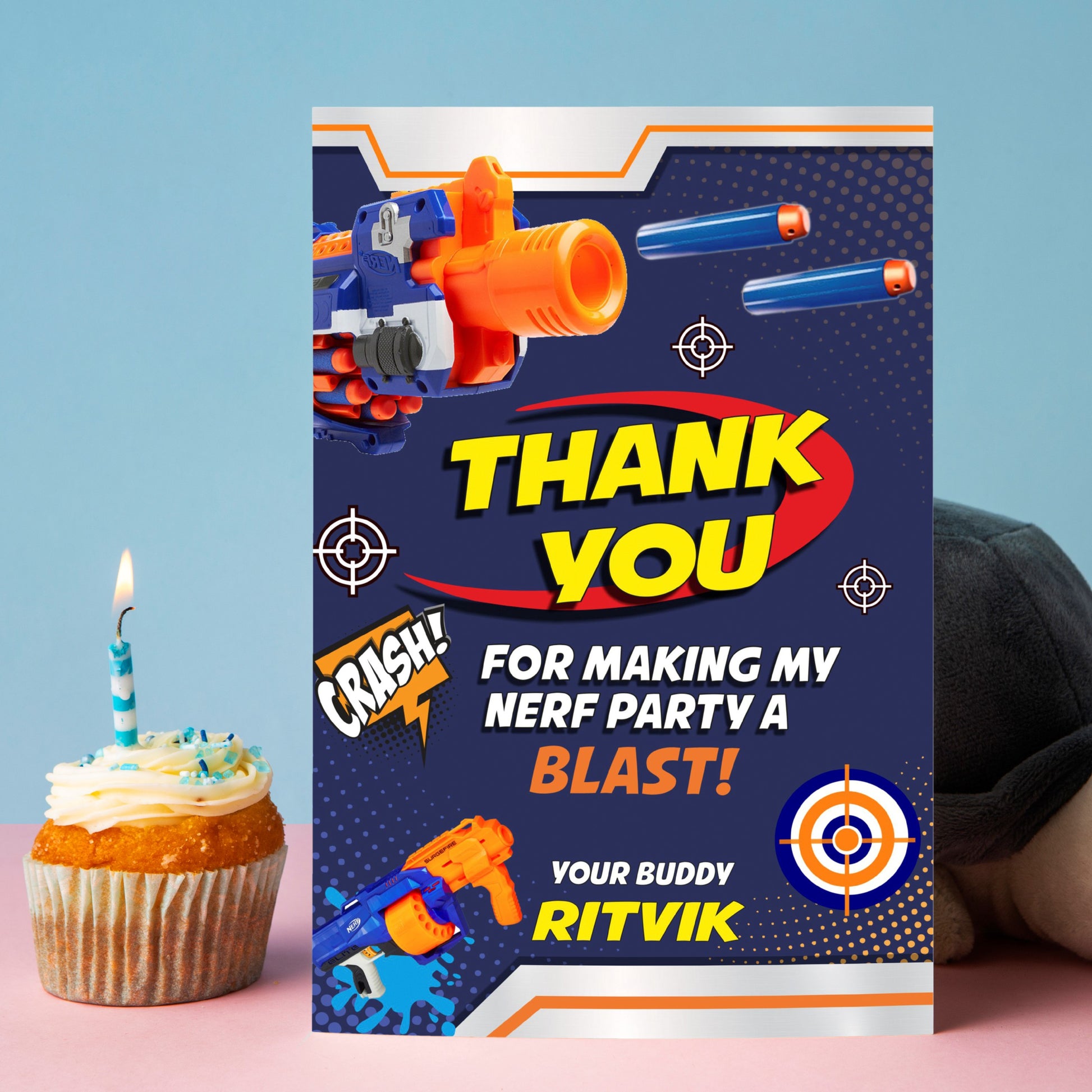 Thanks for joining the foam battle! Our personalized Nerf Gun thank you cards are the perfect way to show your appreciation. Featuring a cool Nerf blaster and a fun "Mission Accomplished!" message, these cards can be customized with a special note from the birthday Commander. They're an energetic way to thank everyone for their awesome teamwork and great gifts!