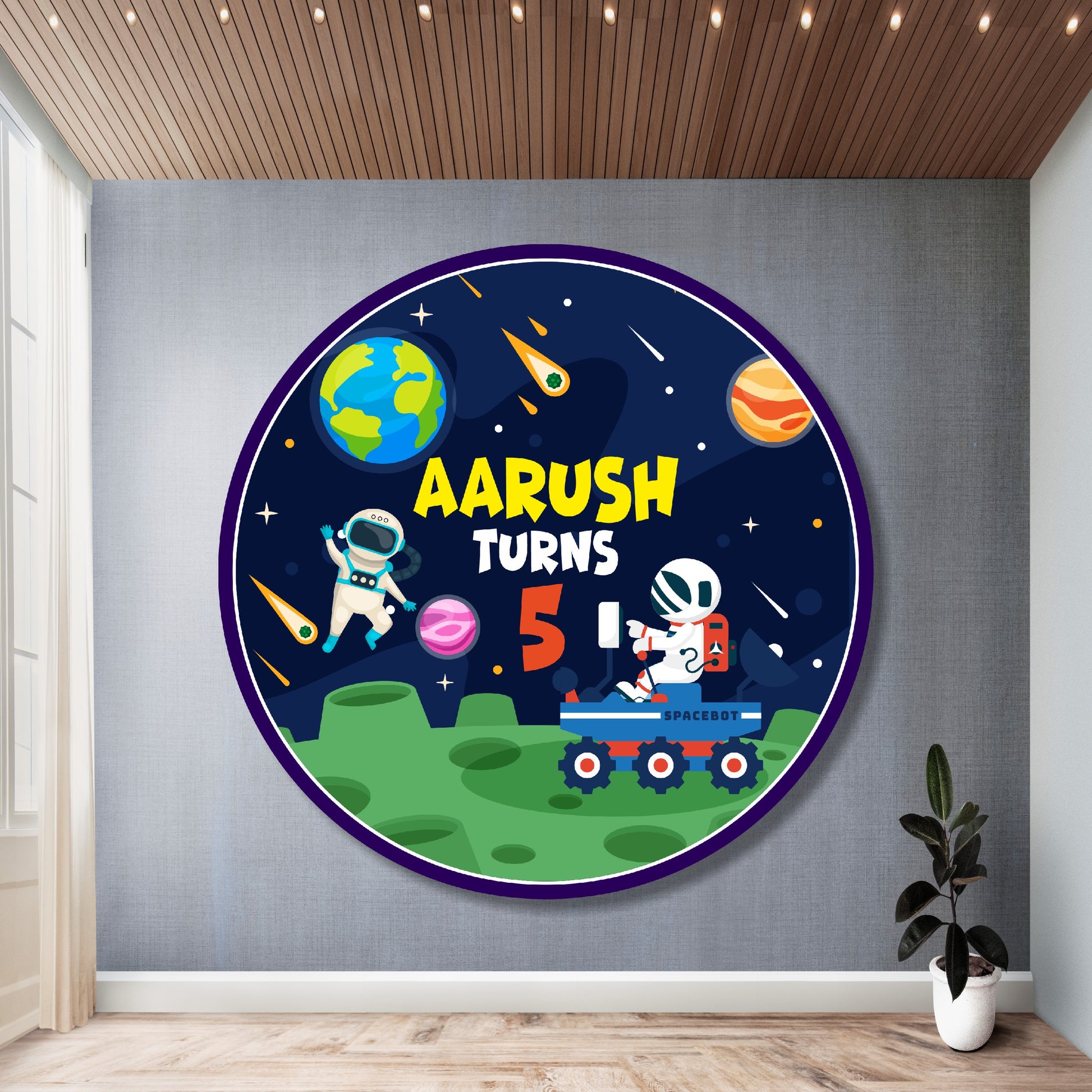 Welcome to Mission Control! Our custom Space-Themed Round Banner is designed with deep indigo and starry black backgrounds, showcasing realistic images of the Earth, the Moon, and a bold spacecraft. This high-quality banner is fully personalized with your child's name and age (or their "Mission Commander" title). It's the perfect statement piece to transform your party space into an immersive, galaxy-spanning adventure!