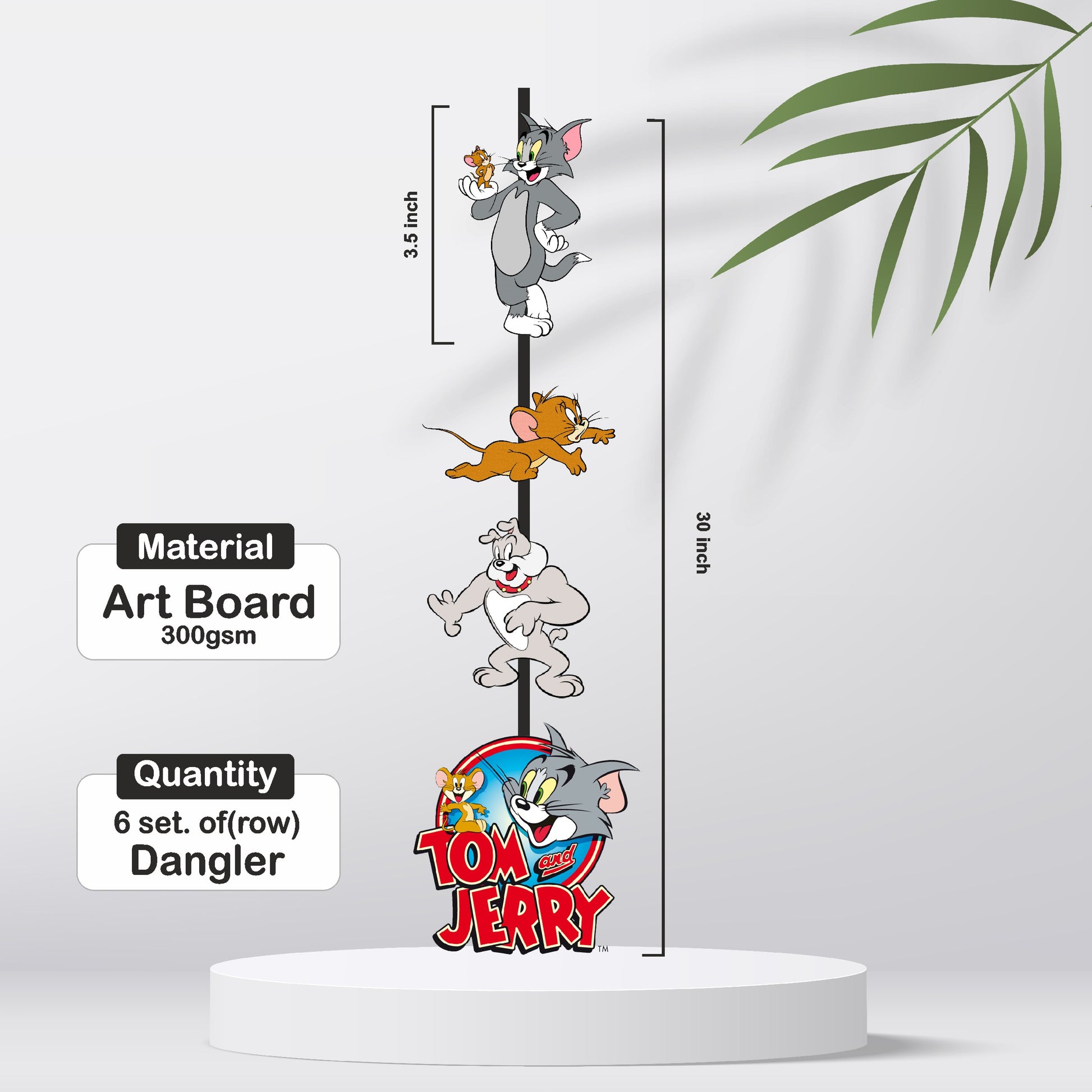 Add some whimsical cartoon chaos to your party with personalized Tom & Jerry Hanging Danglers! These decorations feature awesome cutouts of Tom chasing Jerry, giant wedges of cheese, and funny sound effects on colorful spirals, perfect for hanging from the ceiling. bringing the playful spirit of the classic cartoon right into your party space!