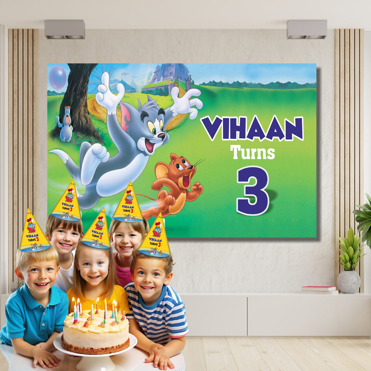 Make their birthday a classic cartoon adventure with a custom Tom & Jerry-themed banner. This vibrant banner captures the playful rivalry of Tom and Jerry with fun, action-packed graphics. Personalize it with your child's name and age to create a one-of-a-kind decoration that sets the stage for a day of silly antics and unforgettable memories.