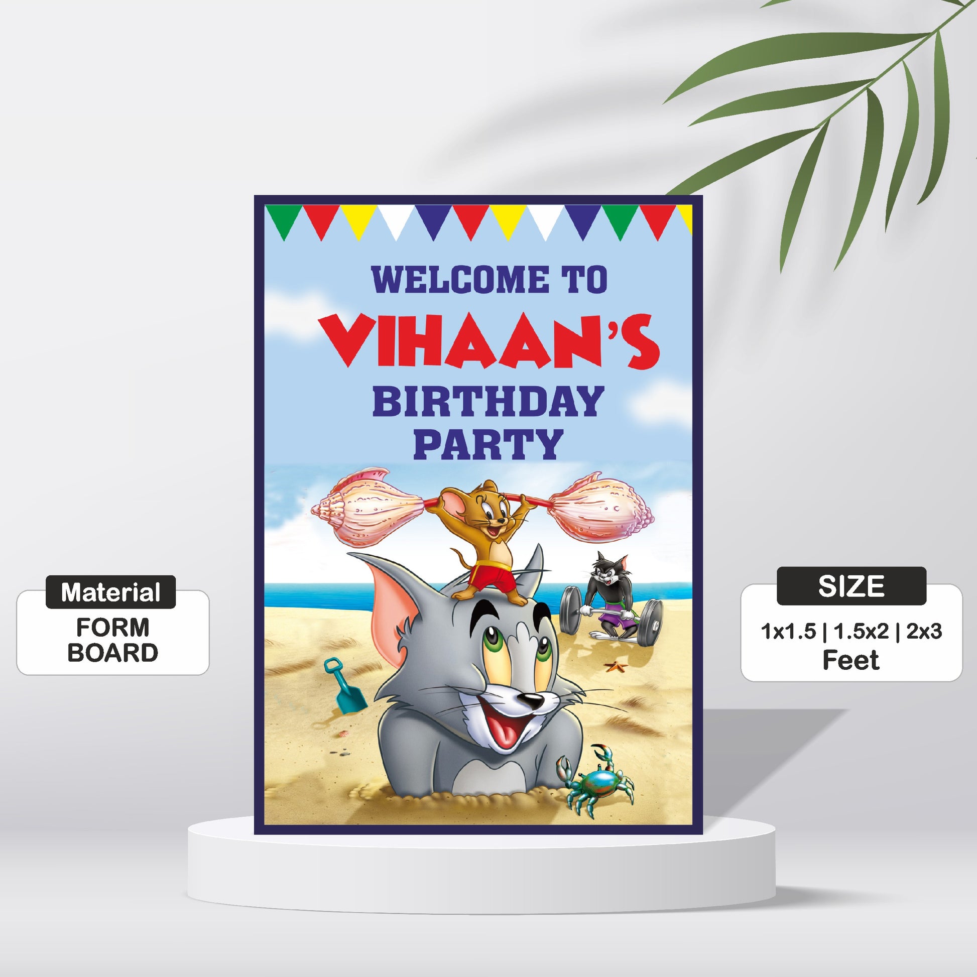Welcome, Cartoon Fans! This personalized Tom & Jerry welcome board features a fun, hilarious scene of the iconic duo in mid-chase. You can customize it with your child's name and age, making it the official entry point to an epic day of cartoon chaos and laughs!